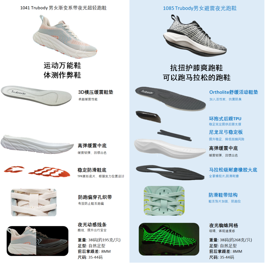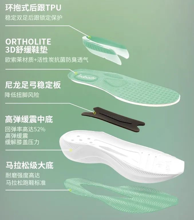 之前开团没多久就断码了,收到穿了的姐妹都一顿夸夸。因为实在太好穿了,还有姐妹忍不住自发在群里晒图帮菜菜打广告。现在就等来升级款二代了,运气好到可以买彩票了哈哈哈!稳定性、支撑性、避震回弹性更强,可以穿着去跑马拉松!诸多小细节也做得更贴心了,颜值也升级了,体验会更棒!特别最近开始运动减肥的朋友,菜菜千叮咛万嘱咐: 千万要穿专业的跑鞋!因为一些看似很软的普通厚底休闲鞋,其实回弹性一般,还不能固定脚踝、稳定性差。而专业跑鞋经过研发设计,包裹性、缓震性、稳定性、回弹力都很优秀,能够保护我们的脚踝和膝盖免受损伤。专业缓震中底+特殊结构支撑,保护膝盖、脚踝、足弓,防止扭伤。科学的落差+弧度,还能让你跑得更快、更省力,妥妥的体测提高成绩小神器!设计还比普通跑鞋好看,别说运动、散步遛弯的时候穿了,平时搭配上班通勤穿也很OK~说实话,让本吃货看了模特图都有想运动的动力了!太好看啦!不愧是我发现的宝藏名牌Trubody呀,做出来的鞋子功能性和颜值皆有!它所属的集团,至今已经有118年历史,是全球著名的奢牌的重要供应链。作为该集团旗下的自有品牌之一,Trubody有自己的科学实验室、数字化工厂,从原料到设计、开发、生产都是自己负责。整个产品线均由利丰收购的64年历史美国知名鞋企打造,那叫一个专业!同时还有为众多一线大牌运动品牌设计+代工生产的经验,掌握了跑鞋的核心科技。这双跑鞋,是他们工厂为专业运动品牌A*L(Athletic Propulsion Labs)生产的,官网售价2300+人民币。甚至因为性能太好,2011年至今,一直被NBA禁止球员在比赛中穿着。咱们这款出自同一生产线、一样的材料、工艺,还改良了外观,菜菜开团300+就能带走!!!同一梯队的运动品牌,类似款的专业跑鞋基本都要2000+↓而Trubody这款原价值2300+的专业跑鞋,在菜菜这直接捡漏!想买新鞋的朋友、准备出门跑起来的姐妹、家有喜欢登山的父母,这双鞋必囤啊!!Trubody的鞋子之所以有那么好的缓震和回弹,很大一个原因就是因为用料好且足。别的鞋子单独拆解下来,只有鞋底+大底,而这款拆下来足足有五种东西!官方给出的数据,回弹率高达52%!直接秒杀了市面上一大半的跑鞋!回弹率越好,足部减震效果就越好,膝盖关节所受的压力也大大减少了。走路、跑跳都能感受到明显的回弹助力,就像有双隐形的手在帮你托着足底一样。光软还不行,Trubody还给这款鞋子额外添加了环抱式后跟TPU,像一个安全座椅一样牢牢地锁住后跟。搭配上保护足弓的尼龙足弓稳定板,能够稳定住脚不乱跑,大大降低了足部过度翻转、扭脚的风险。最上面那一层,是3D立体结构的ORTHOLITE鞋垫,能同时给到后跟减震+足弓支撑+前掌按摩的作用。而且哦,前掌和后掌都有微微翘起的弧度,前后的落差只有8MM。跑步的时候可以像车轮一样滚动,接地时间能缩短7%。这样的科学落差+弧度设计,能更省力、还能提升速度。体侧或者比赛的时候穿上这个“作弊小神器”,成绩直接飞跃!