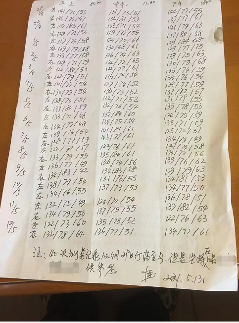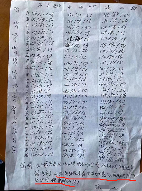于是,老苗给老爸开始用中医方剂治疗高血压。第一服方子,7天,老爸依从性很好,按时服药,每天准时记录血压。可是,一周下来,血压并没有明显的下降。这时,老爸开始对中医的治疗效果动摇了。老爸在血压检测记录的那张纸上留了这么句话:“(血压)从测定数据来看没有多大变化,我想还是(用)降压西药,你觉得如何?”