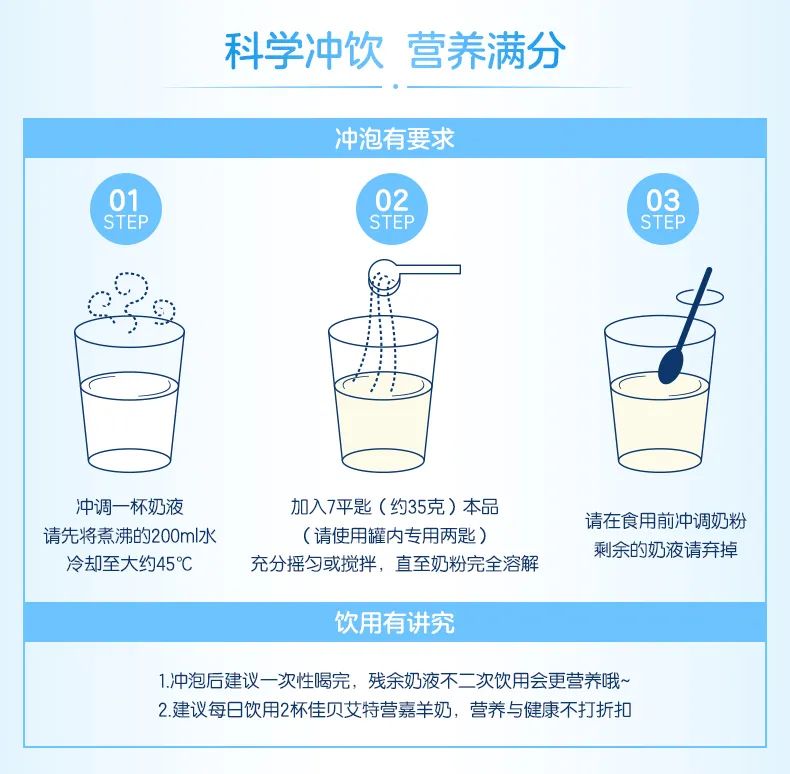 冲泡起来也很简单,用45℃左右温热的水200ml,加入7平勺(赠送小勺,每勺5g)羊奶粉,充分搅拌均匀即可。