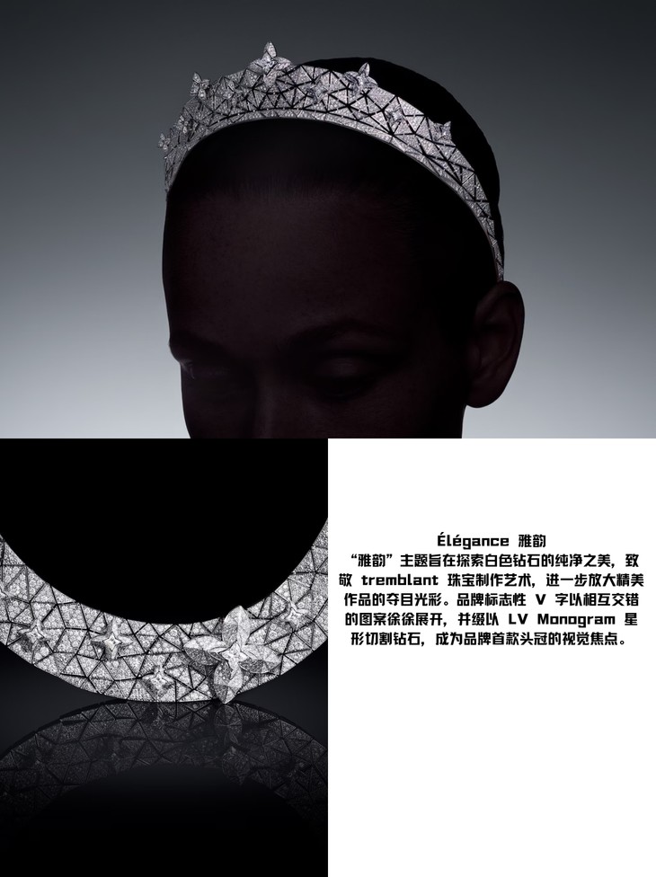 Élégance 雅韵:这一主题探索了白色钻石的纯净之美,并致敬tremblant珠宝制作艺术。品牌标志性的V字以相互交错的图案展开,并缀以 Monogram星形切割钻石。紧密排布的几何图案彰显盎然意趣,预示着“匠心”篇章中即将上演的机械化进程。