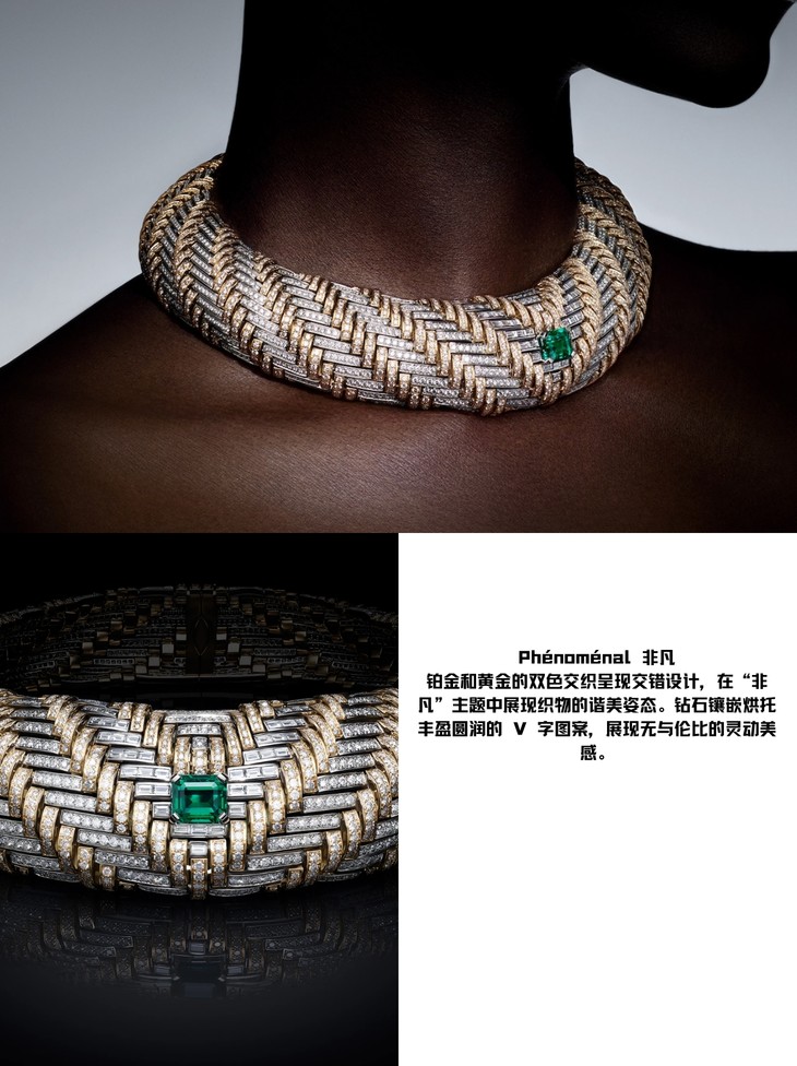 Phénoménal 非凡:在这一主题中,铂金和黄金的双色交织呈现交错设计,展现织物的谐美姿态。钻石镶嵌烘托丰盈圆润的V字图案,主石为一颗重5.07克拉的赞比亚祖母绿,令整个作品展现无与伦比的灵动美感。