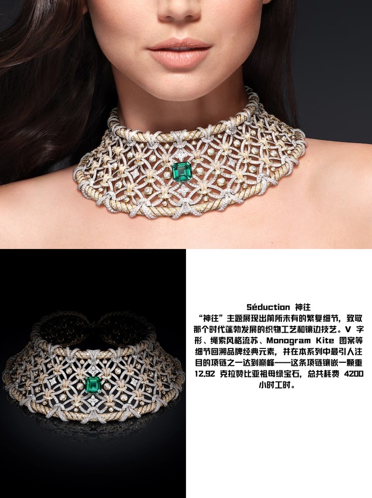 Séduction 神往:这一主题展现了繁复细节,致敬十九世纪蓬勃发展的织物工艺和镶边技艺。路易威登的经典元素如V字形、绳索风格流苏以及Monogram Kite图案在这一主题中得到了体现。其中,一条镶嵌一颗重12.92克拉赞比亚祖母绿宝石的项链,耗费了4200小时工时,展示了无与伦比的精细工艺。