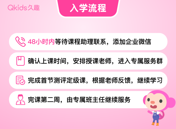 报名后,添加班主任微信,班主任会在48小时内联系您,了解孩子的基本学习情况,建立专属学习群,并安排测试。(比如:孩子几年级?校内是一年级起点还是三年级起点?校内用什么教材?校外是否有培训?用的是什么教材?听力和口语怎么样?)