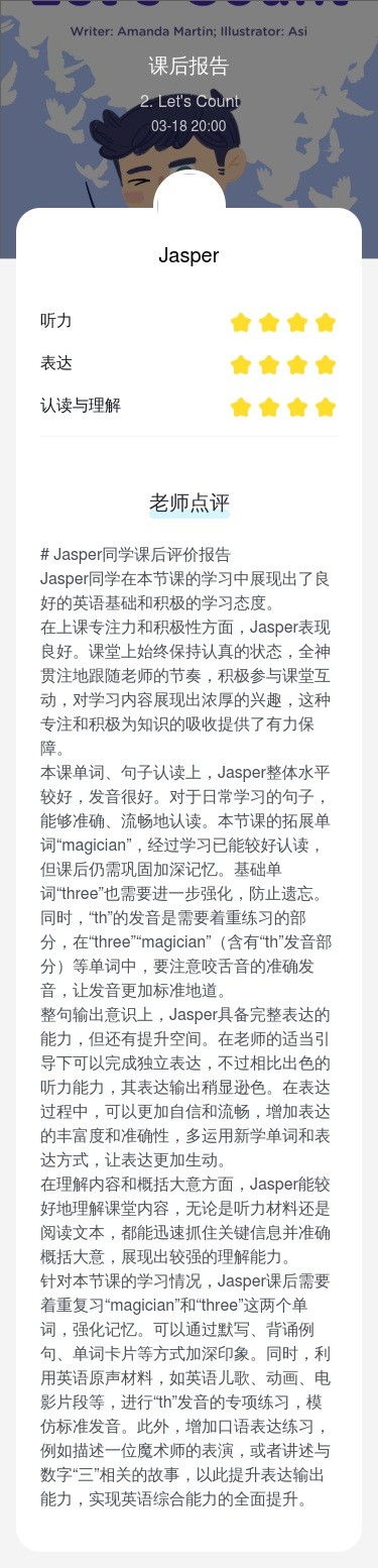 课前班主任协助学员完成定级评估,课后班主任会第一时间给家长发送学习报告。并且在整个学习过程中,持续提供与孩子学习紧密相关的学习服务与资料。