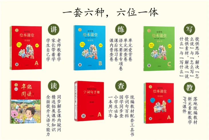 它包括A学习书、B练习书、C素材书、年级阅读和字词句手册。