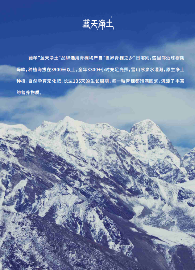 德琴阳光的“蓝天净土”品牌寓意为“蓝天之下,净土之上,孕育着信仰与希望。”蓝天净土的信仰密码,如青稞的生长与烹饪,是遵循自然,敬天惜物,保留食材的本初口感,返璞归真;蓝天净土的希望密码,是让健康的青稞走出高原,走上千家万户的餐桌,用消费的力量给西藏人民带来致富新希望。