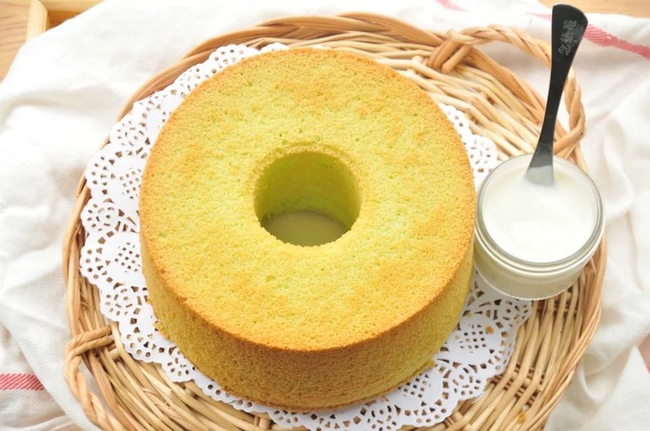 7、再把翻拌好的蛋白蛋黄糊倒入装蛋白的盆中,继续翻拌均匀,倒入中空戚风模具中(18厘米中空戚风模),然后按住中空部分,震几下模具,震出大气泡