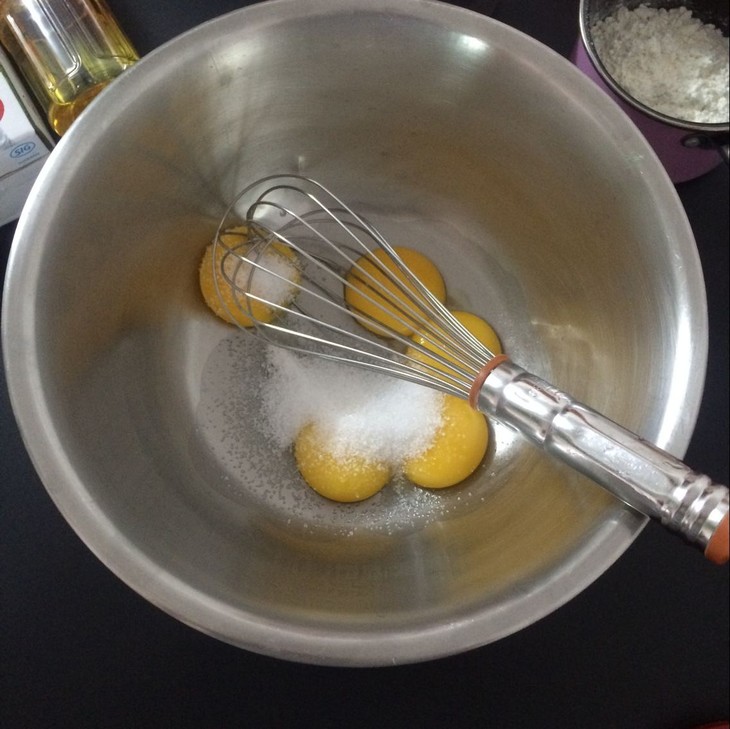 2、蛋黄加入25克糖搅拌均匀。(剩下的60克糖等会要加入蛋白中的。)