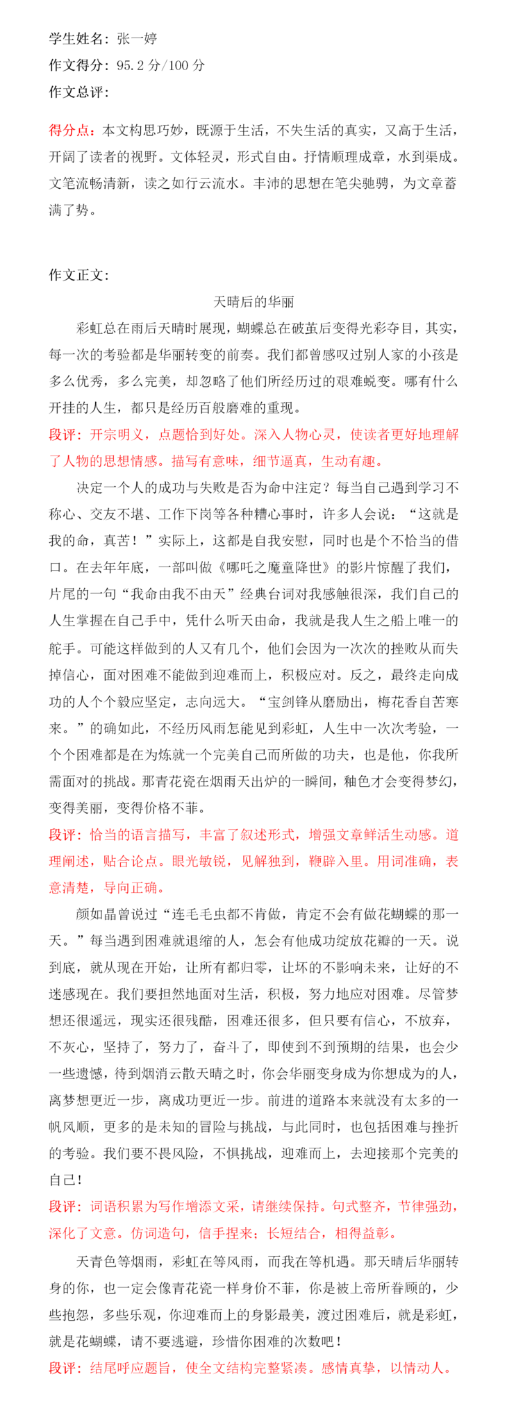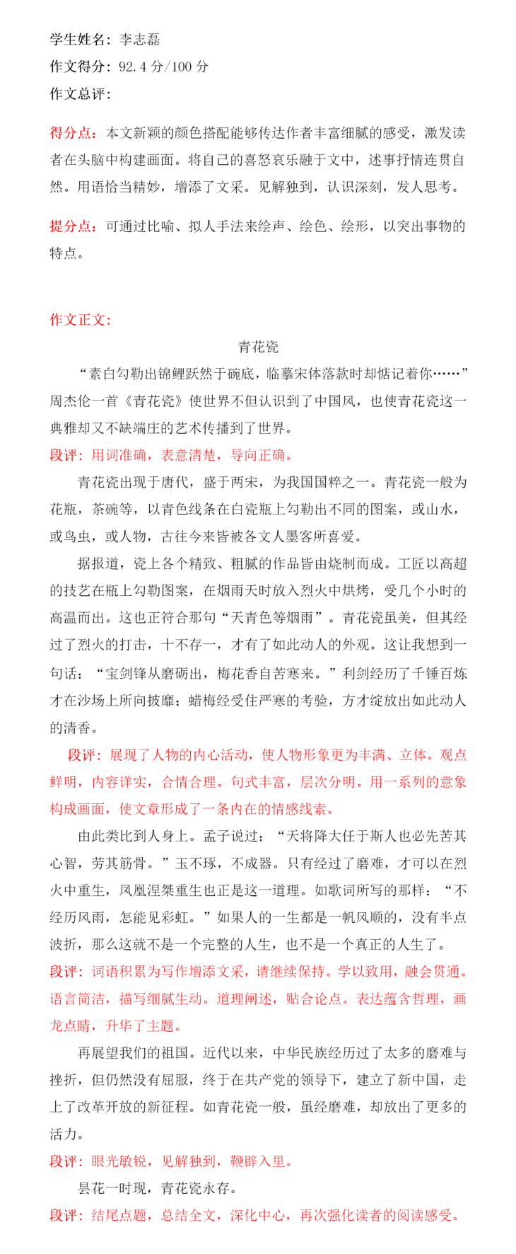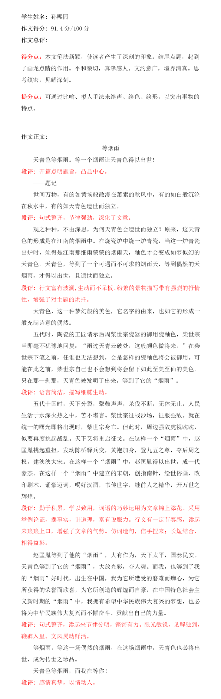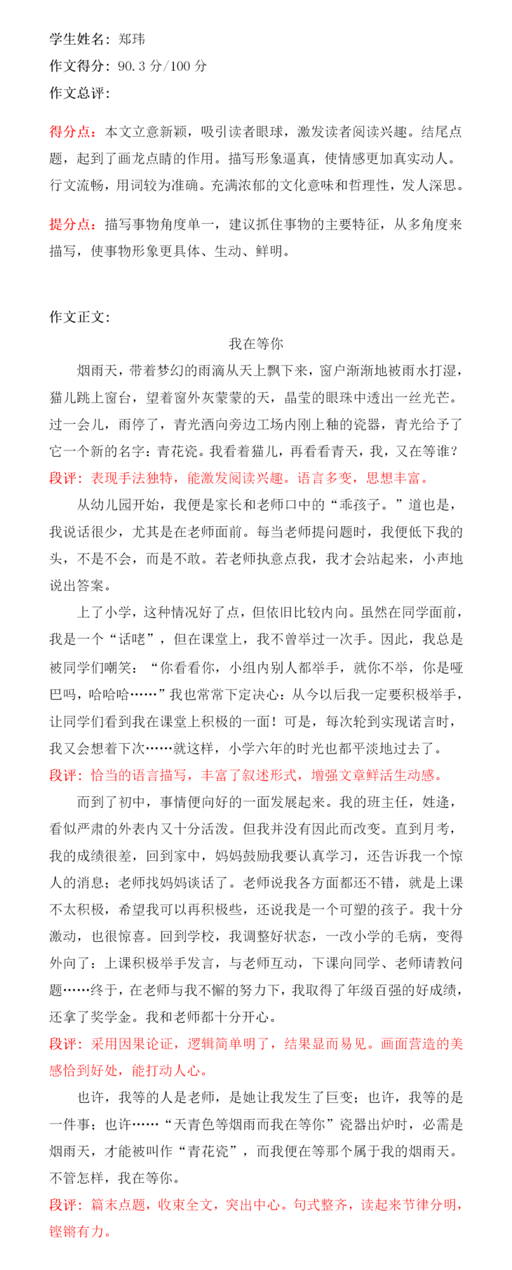 小作者按时间顺序,写出了由于自己性格内向,上课不敢举手发言的苦恼和无奈,直到遇到初中班主任逄老师,一次间接的鼓励,使自己冲破了内向性格的桎梏,变成了一个积极外向,敢于跟老师互动的孩子。其中的欣喜溢于言表。天青色等烟雨,而我在等谁?等那个等那个能打开自己心扉的可亲可敬的班主任老师,等那次改变自己性格的鼓励。小作者的笔触细腻饱满,感情含蓄内敛,娓娓道来,能使人产生共鸣。