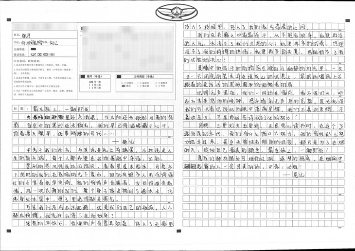 孩子小的时候就已经“呼吸作文”上了,这次作文比赛,也是自己踊跃参加的,还真没想到孩子能写出一定的水平。在这里家长希望你以最饱满的热情、最昂扬的斗志、最刻苦的精神、最坚韧的毅力,全力以赴,坚持到底,满怀信心地去迎接中考,争取考出优异的成绩!人生能有几回搏?此刻不搏更待何时?珍惜机遇吧,让金色的年华碰撞出更加灿烂的火花!