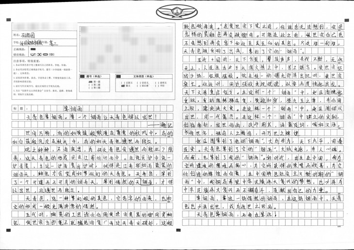 当我看到这个话题时,霎时间脑海中想到青花瓷出炉的烟雨恰是一个时机。回顾历史展望未来,我想到了赵匡胤抓住时机发动陈桥驿兵变,建立大宋;我想到在中国特色社会主义新时期,我们每个人都拼命抓住时机,创造辉煌。通过题目又找到青花瓷和天青色名字的产生都是在特定的时机下。再通过一定的语句连接使得作文语句通顺,这篇作文便大功告成。