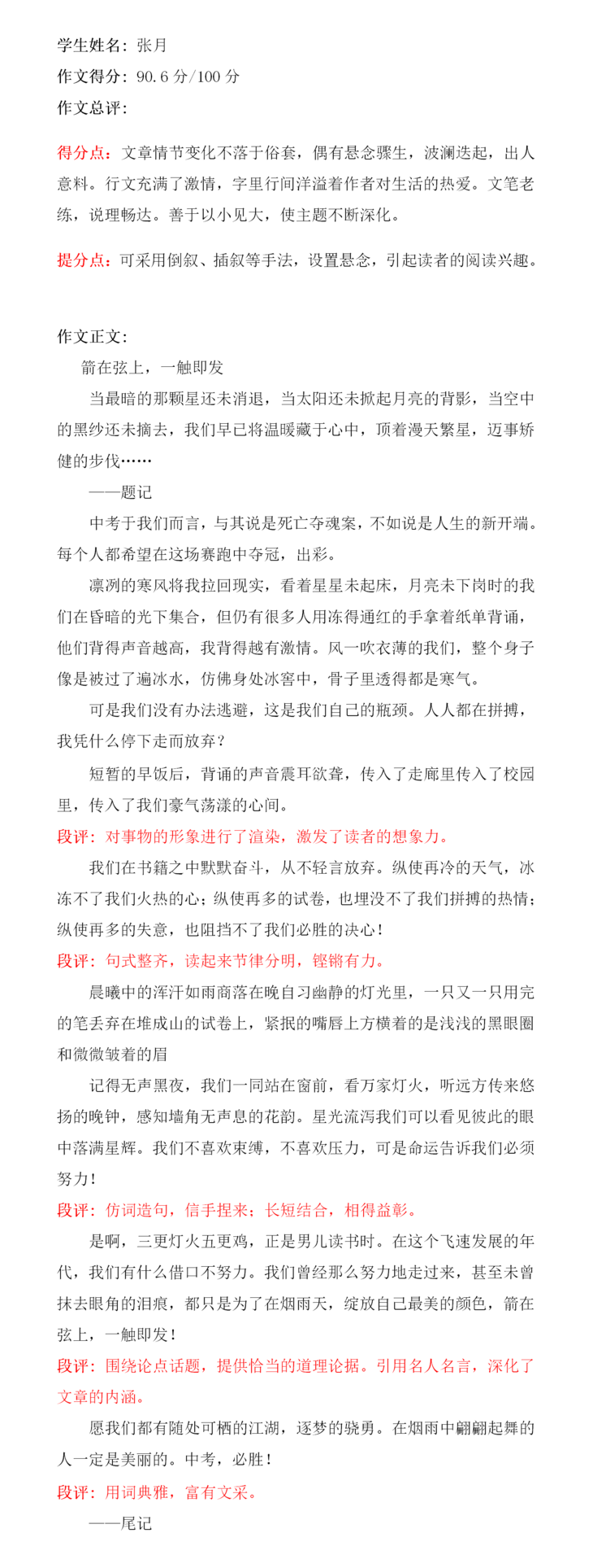 文章写了小作者自己起早贪黑、勤奋苦读,向着目标奋斗的漫长经历。虽然学业沉重,但自己没有一点怨言、没有一丝的气馁,反而有的是不达目标绝不罢休的信念,对读者有深远的教育意义。文章采用题记、尾记的形式完成,题记用排比句,语言优美、语势强烈;尾记简洁有力,给人极大的鼓舞,且结尾与文题照应,中心明确,结构严谨。
