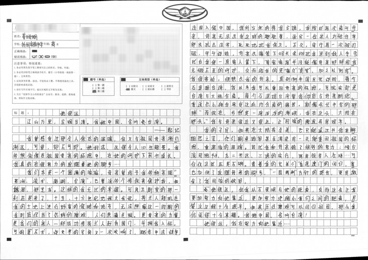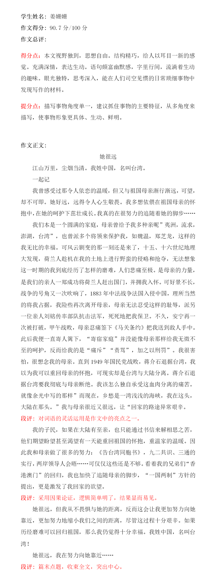 本文的写作灵感来自对“一国俩制”的理解,相比较已经回归的香港和澳门来说,台湾这个热点地区长期以来备受广大爱国人士的关注,它是中华民族不可分割的一部分,与大陆血脉相连。在寻求语文老师和历史老师的帮助下,了解到了更多关于台湾的事件,丰富了我的写作素材,有利于构建一个更清晰的逻辑体系。本文站在台湾的角度,把“她”比作中国,以“她”对我的爱为线索贯穿全文,表明了“我”回归之决意,即使这条路困难重重,“我”也不会望而却步。