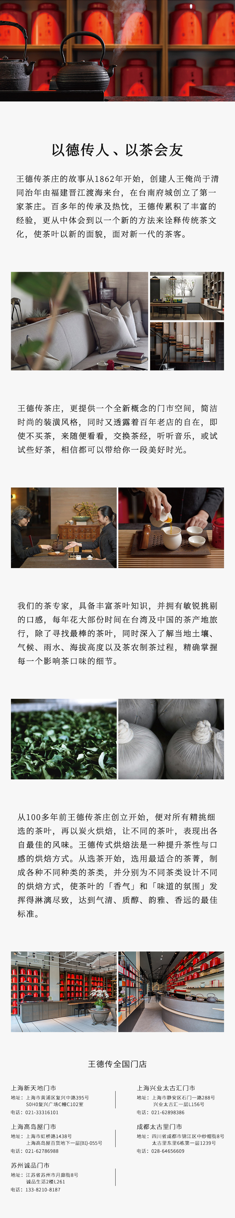 1862年,王俺尚先生从福建来台,在当时台湾的首府—台南,创立了第一家茶庄。百多年的传承及热忱,王德传累积了丰富的经验,更从中体会以新方式诠释传统中国茶,融合中国深厚的文化意涵,使茶叶以崭新面貌,面对