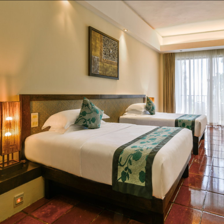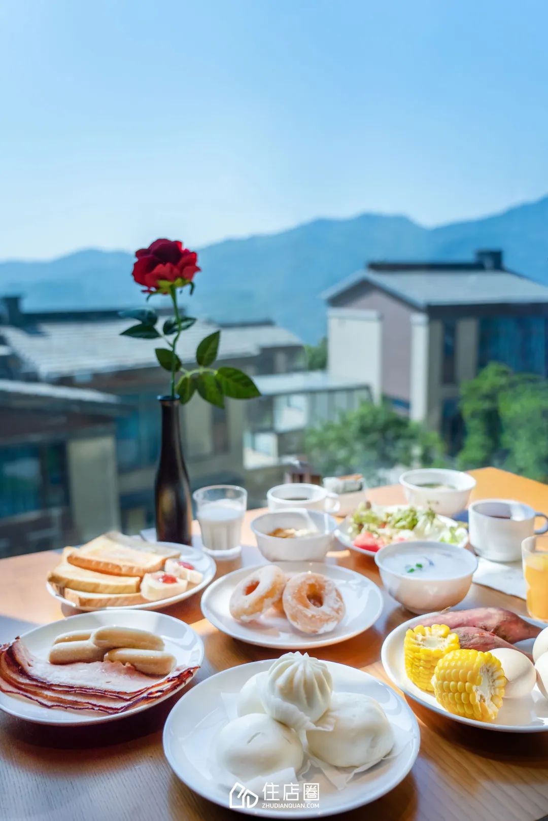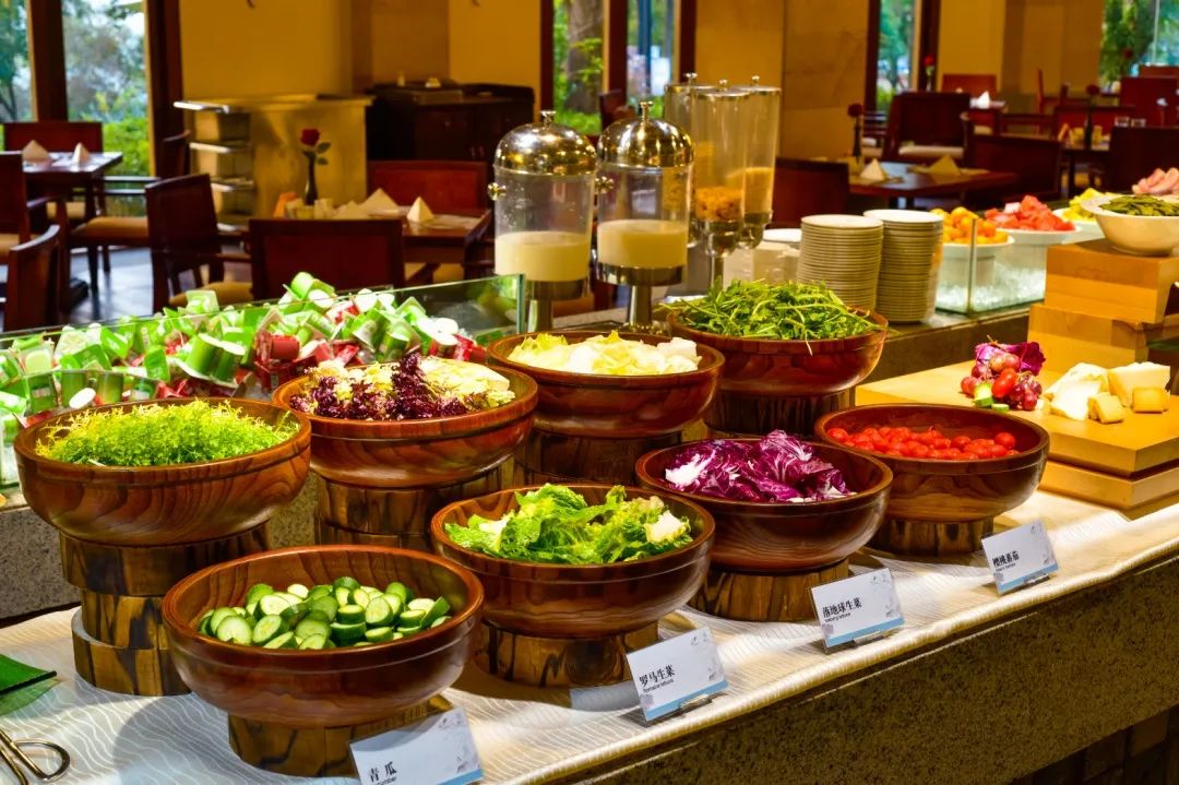 好眠过后,饥肠辘辘急需美食来填补。酒店餐厅供应丰盛可口的中西式自助早餐。坐在超大落地景观窗边,远处水墨般晕开的自然山景尽收眼底,绿森森的林带枝叶曼披,这一片郁葱仿佛就近在咫尺,轻松唤起一早的好心情。