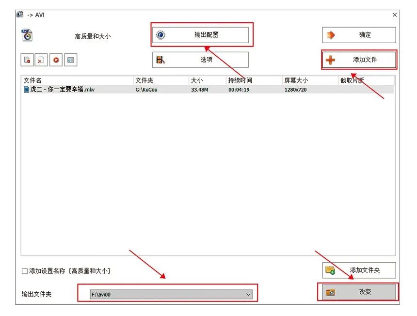 3.点击“添加文件”,设置“输出文件夹”为TF卡对应的视频文件夹,跳舞的真人MV视频请下载到avi00文件夹,跳舞的动漫视频请下载到avi01文件夹,广场舞的视频文件请下载到guangchangwu文件夹。儿童教育视频请下载到boystory文件夹。