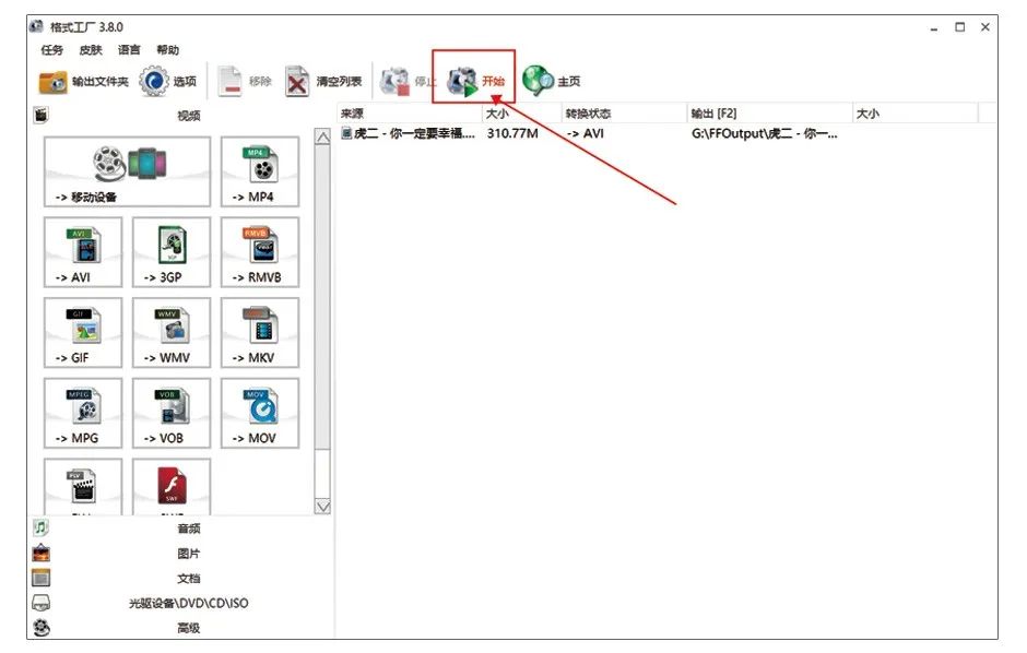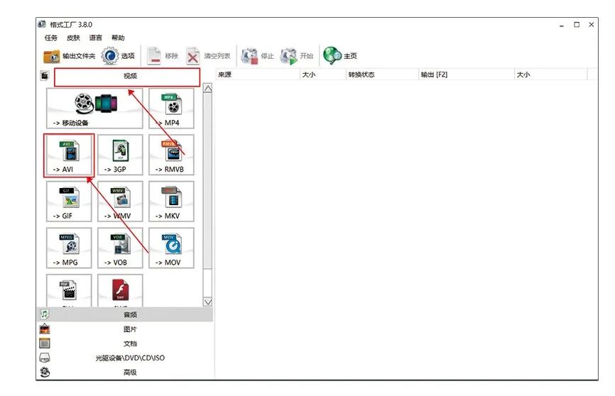 2.转化格式——安装“转换工具格式工厂.exe”到电脑(转换工具在TF卡“视频转换工具使用说明”文件夹,如果转换文件丢失,请联系微信在线客服索要安装文件)。所有下载的MV视频文件,通过“格式工厂”转换成AVI格式。选择点击AVI按钮,如下图所示。