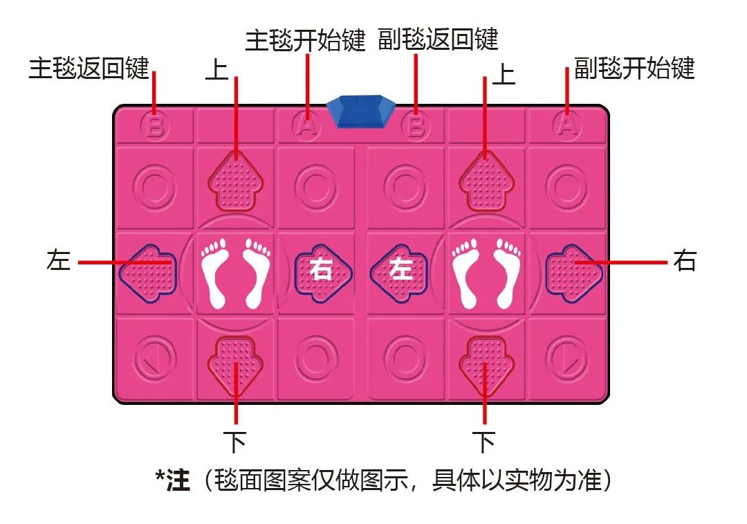 答:双人使用时,为了防止误踩退出,我们设定了主毯(左边毯位)开始键A和返回键B为默认总控制键,有些功能中副毯(右边毯位)开始键A 和返回键B不能控制开始与返回。请用主毯(左边)控制开始和返回。毯面A键对 应电视的START键,毯面B键对应电视BACK键。注:为了防止跳舞的时候误踩退出,跳舞中途退出时候,需要长按踩踏B键3秒以上退出,跳舞舞曲结束打分后踩踏A键确定进入舞曲目录,长按踩踏B键退出。