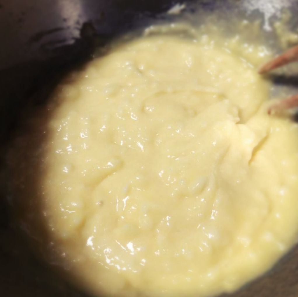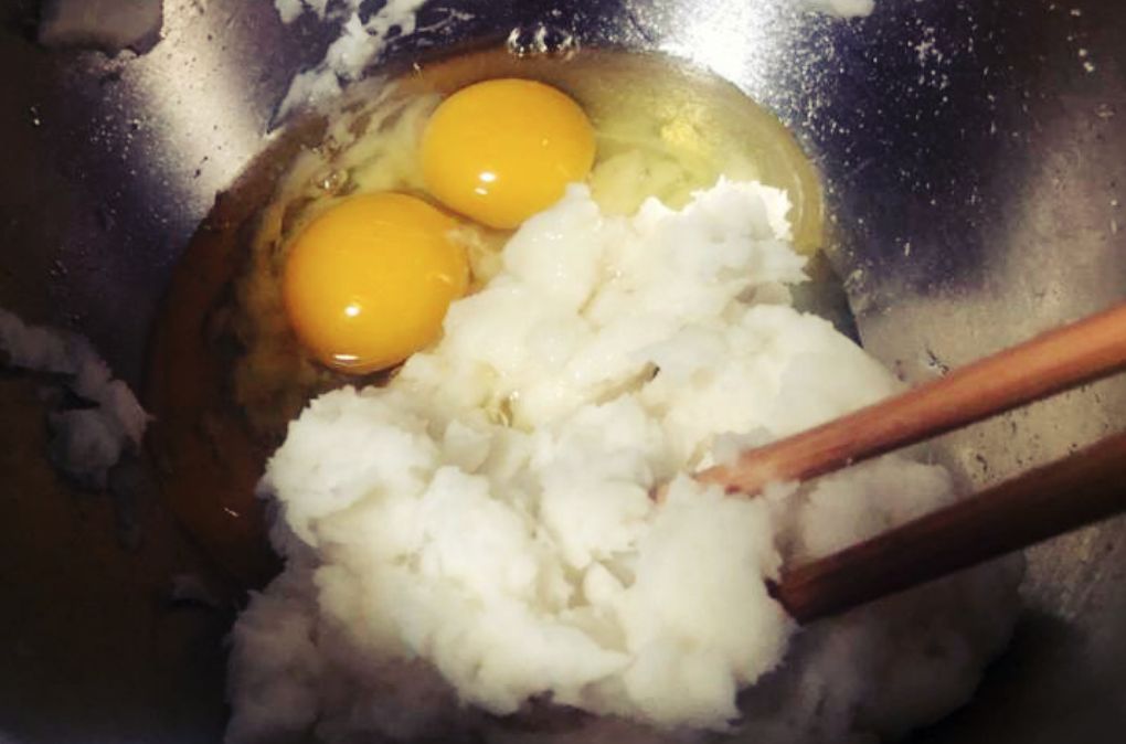 2、将山药碾成泥,放入2个鸡蛋,30g白糖,1勺奶粉,1勺椰子油/黄油/玉米油/色拉油,10g酵母,搅拌均匀;