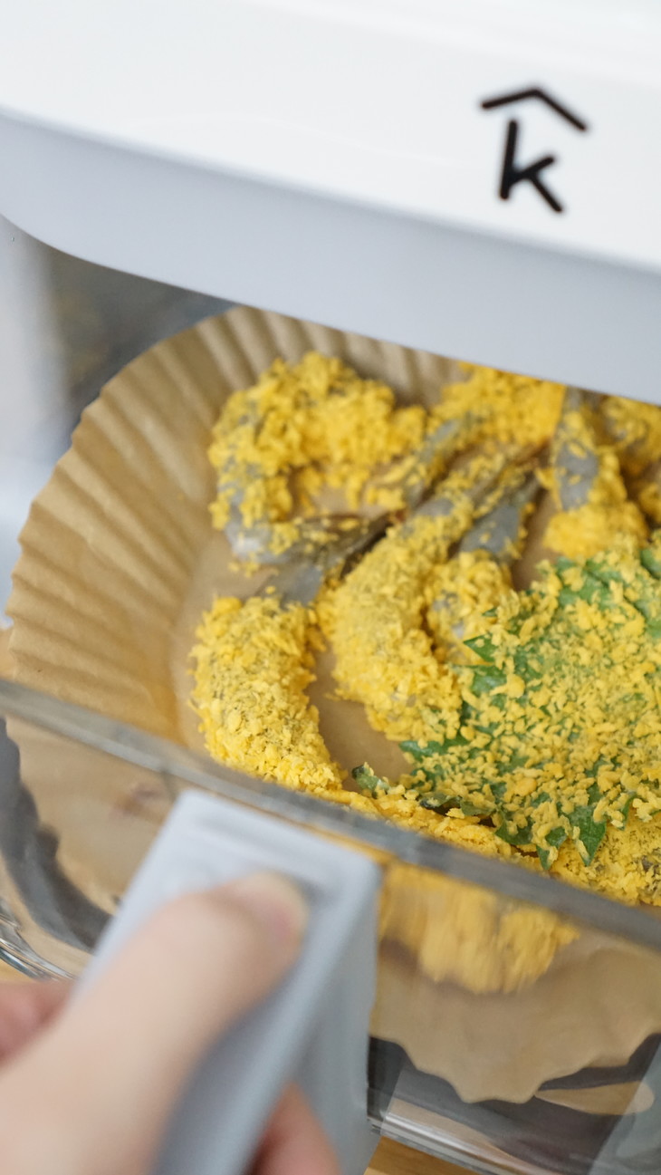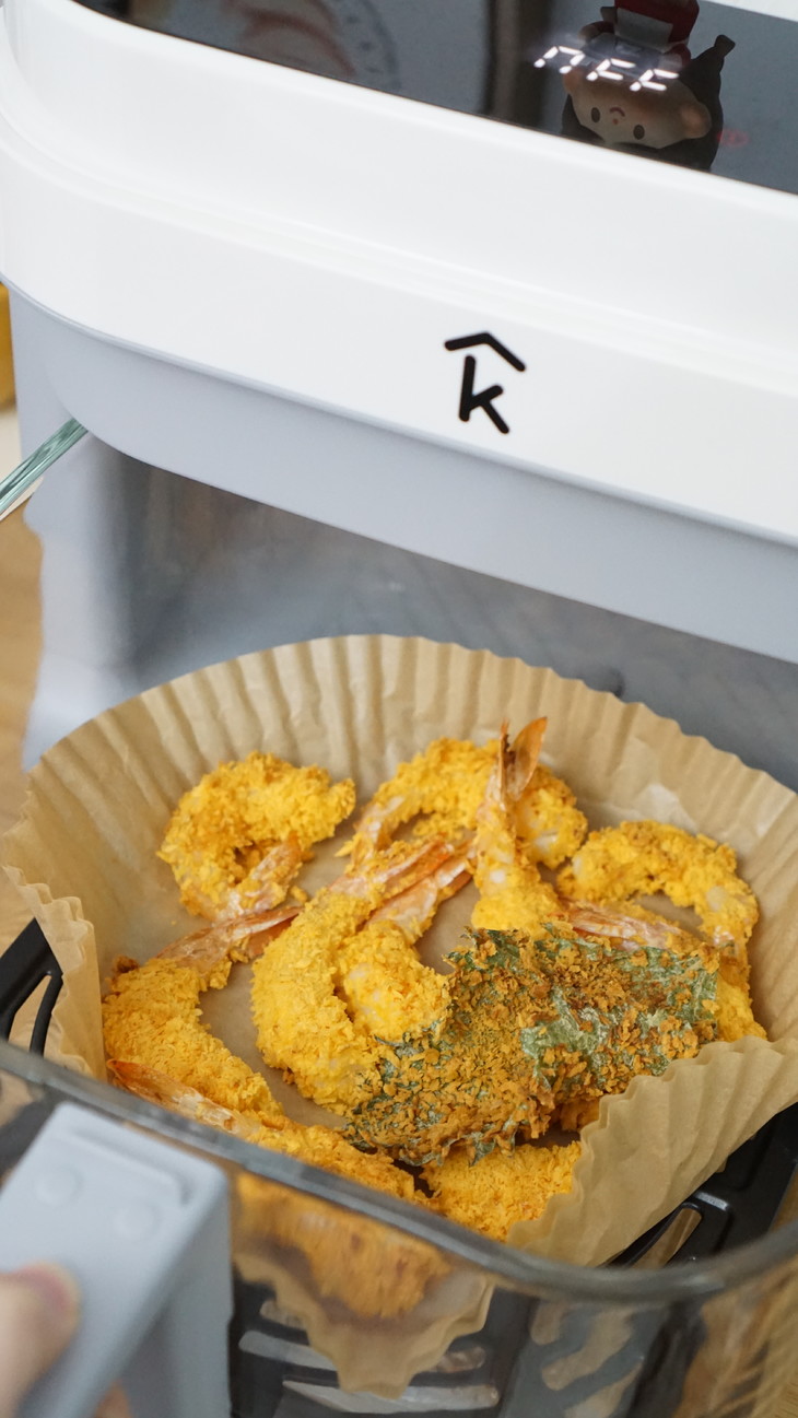 处理好的虾先裹一层天妇罗粉或低筋面粉,然后裹一层薄面糊最后裹上面包糠放入空气炸锅170度烤8-10 分钟,出锅后蘸上番茄酱即可开吃。