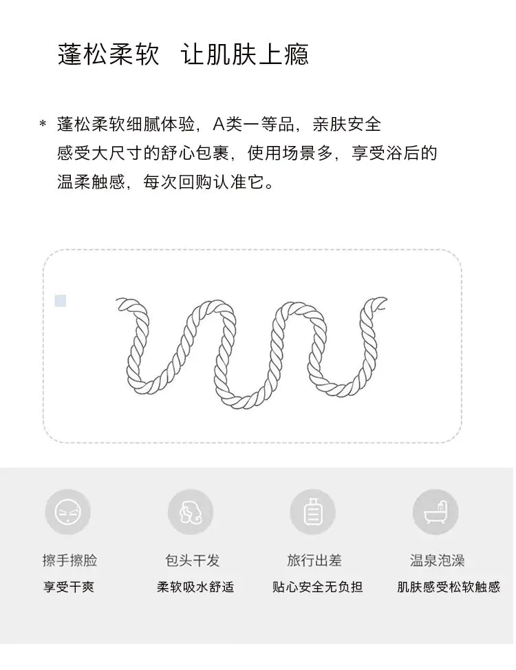 大尺寸包裹感,适用于多种场景(擦手擦脸、包头干发、旅行出差、温泉泡澡等)。