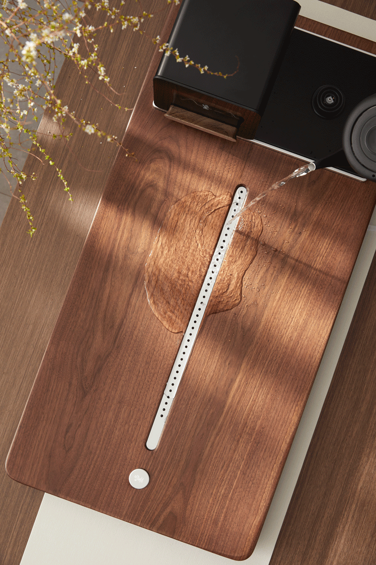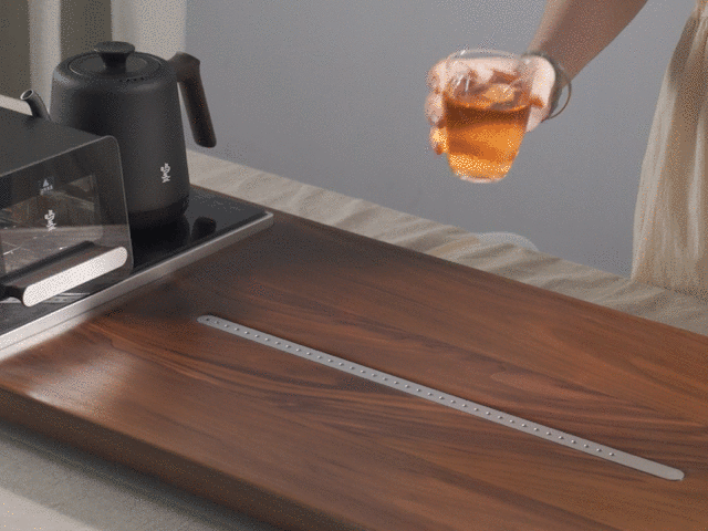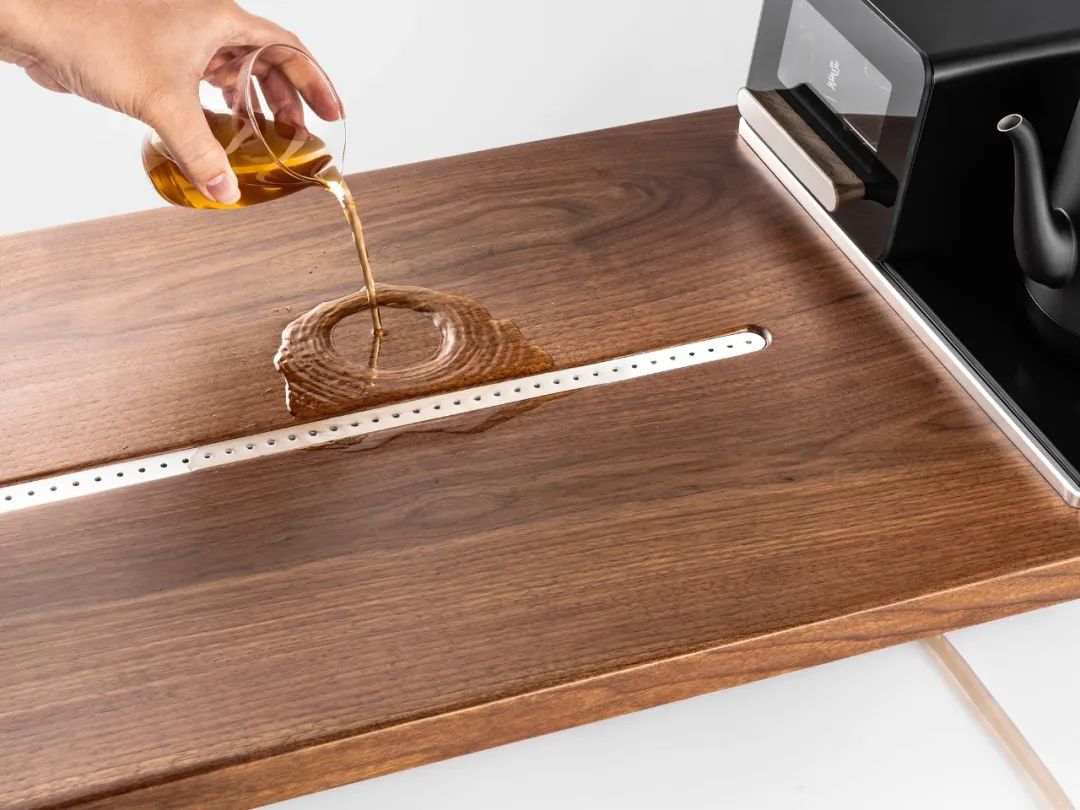 宛如一道银线的中央铝合金排水口,快速汇聚四方茶水,呈现“高山流水,银流相聚”的美好寓意。