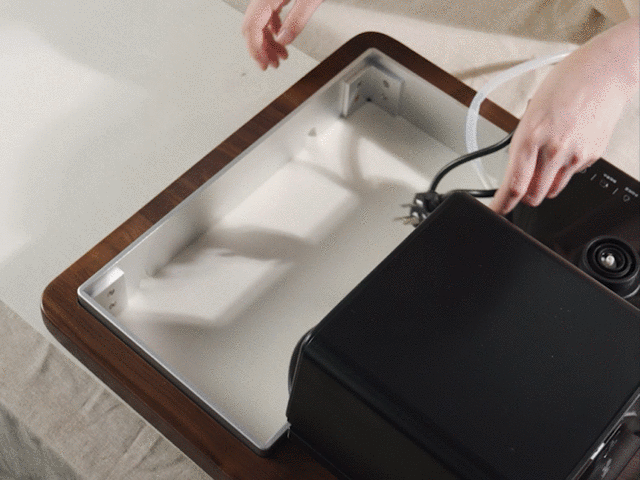 先分别将电线和排水管穿入,随后放入茶艺壶。