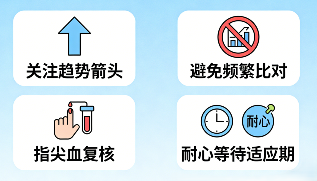 在初期,更应关注血糖变化箭头和曲线趋势,而不是某个绝对数值,趋势对判断身体状况同样重要。