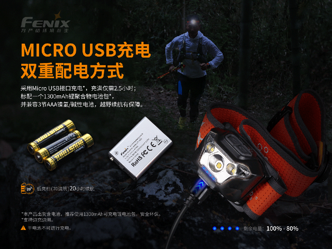 另外,HL18R-T支持双重配电方式,标配1个1300mAh锂聚合物电池包的同时还可以兼容3节AAA电池,AAA电池在街边小店、超市便利店等随处可见,将其放到背包里收纳,占用地方较小,可轻松背负。
