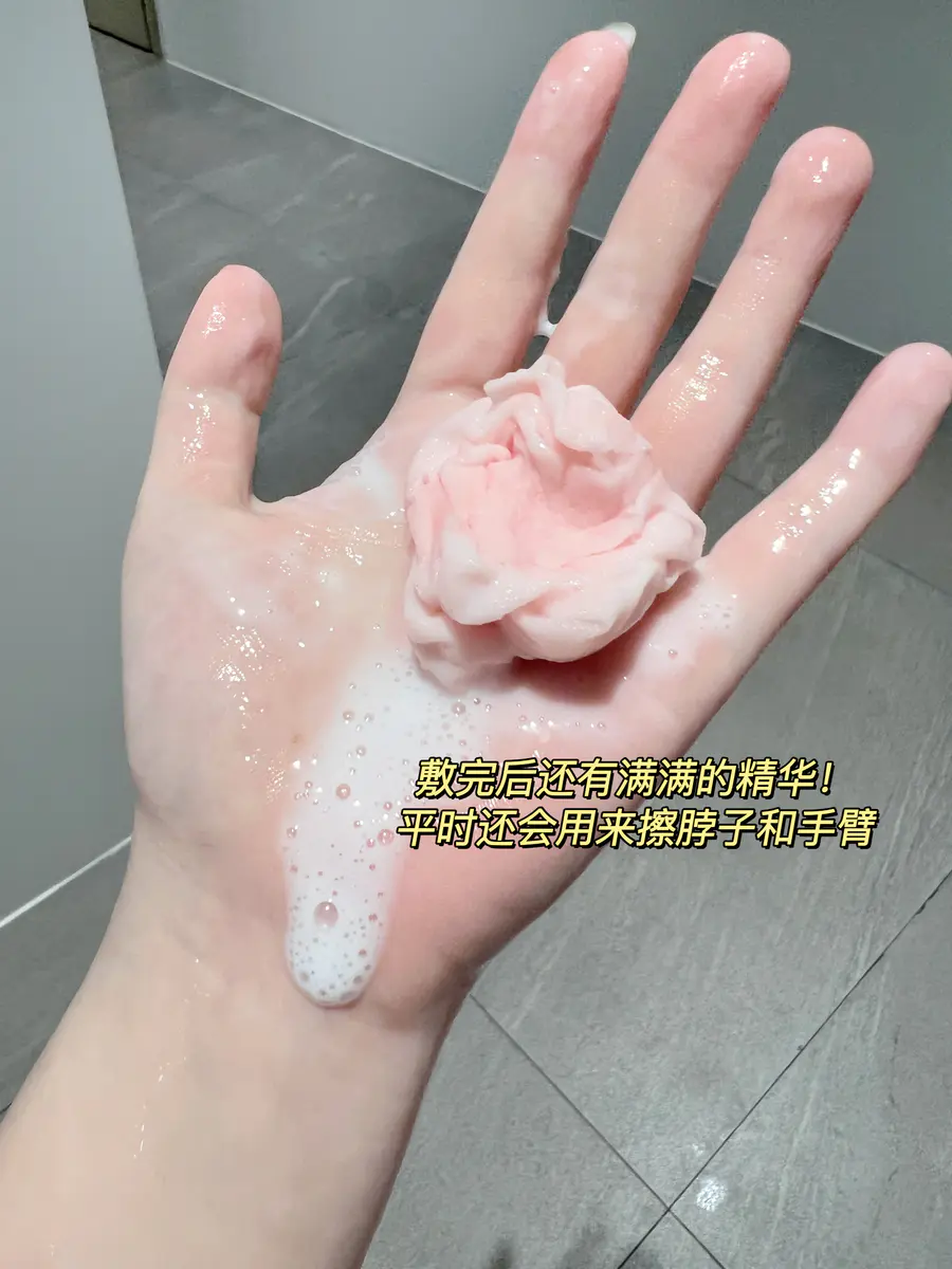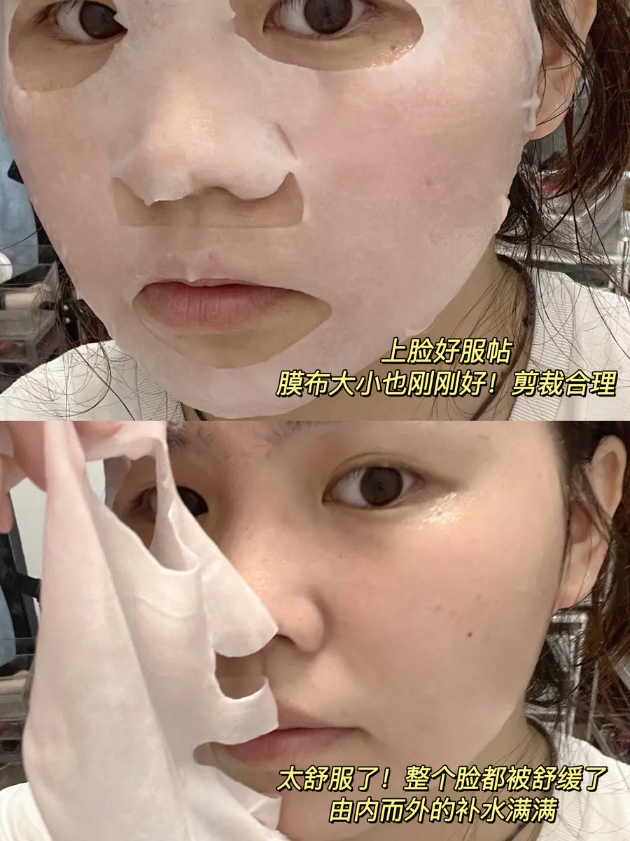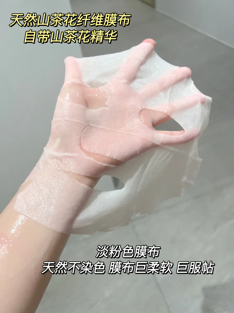 它的膜布也不得不夸!山茶花植物纤维膜布!软糯又服贴!天然的淡淡粉色!真的很山茶花贴上脸后能感觉皮肤在吨吨喝水敷完后干燥紧绷的皮肤都水润有光泽!皮肤真的有在慢慢养好!