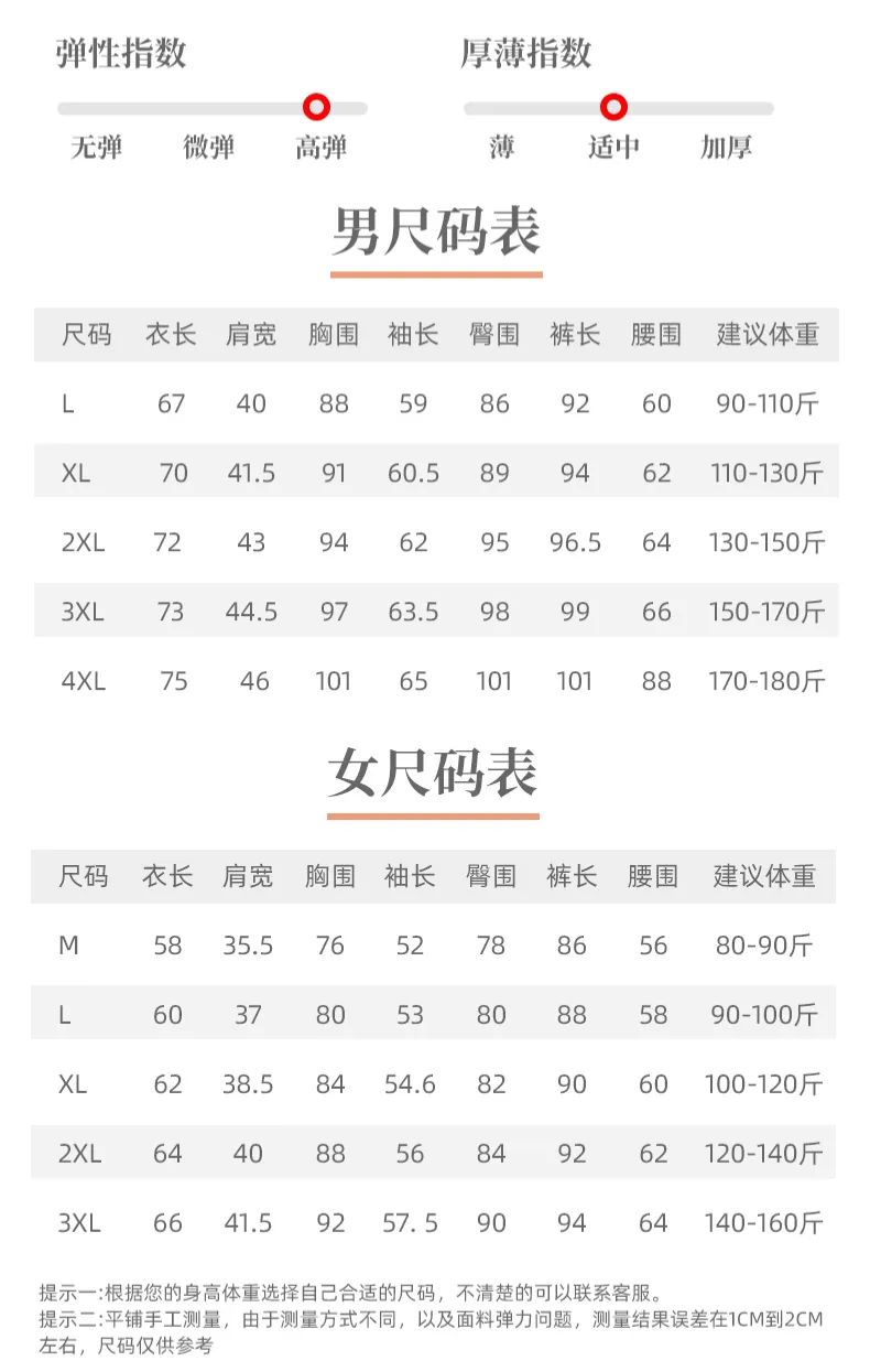 女款90-150斤都可以穿,男款90-200斤,尺码表给大家附上: