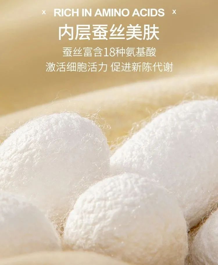 利用高分子技术,将蚕丝蛋白和纯植物纤维融合,富含18种氨基酸,滋养肌肤,具有滋养肌肤的美肤效果。