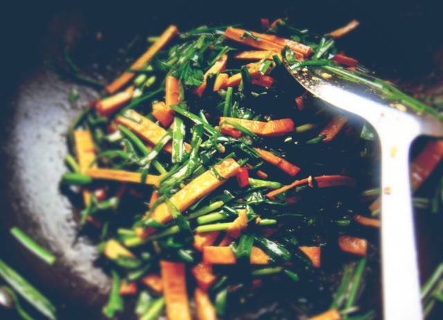 2、先放入韭菜根,再放入韭菜叶,嫩绿色变成深绿色,关火,这道菜就做好了!
