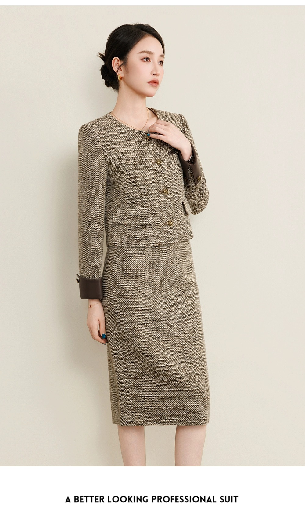 上衣是短款的小香风外套,采用了经典的粗花呢面料,颜色为雅致的灰棕色,细腻的纹理交织出独特的质感,仿佛诉说着法式浪漫的故事