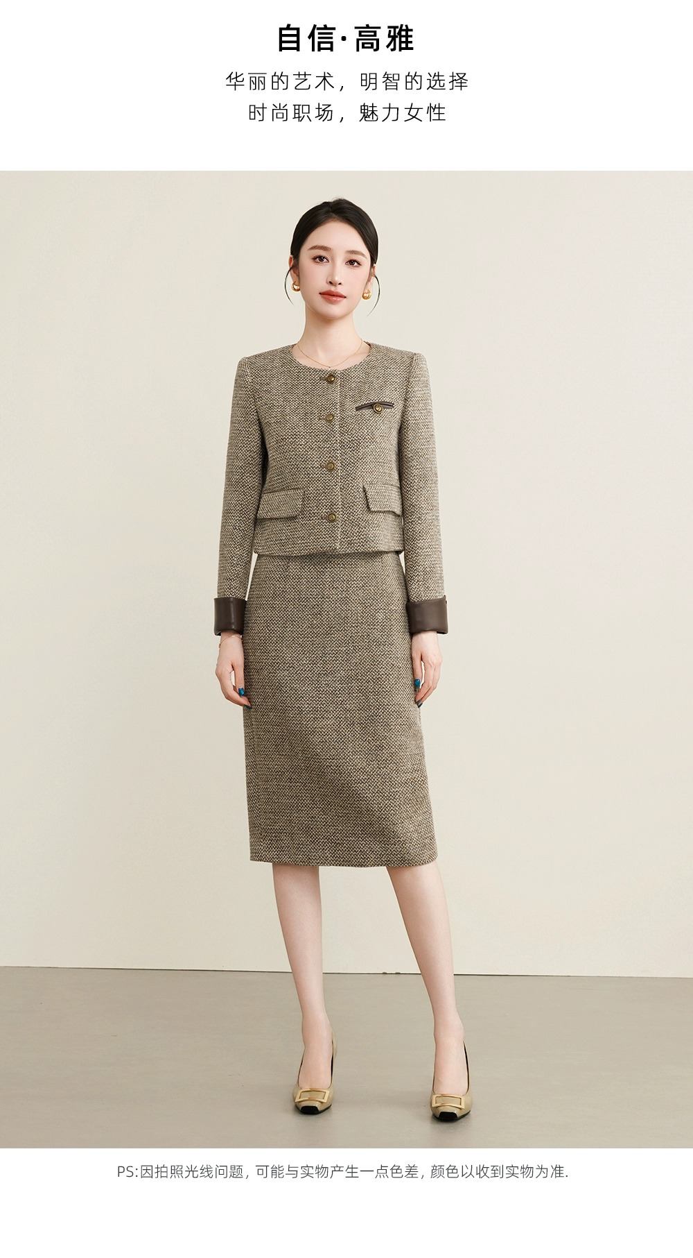 下装是同面料的包臀裙,长度适中,能够很好地展现女性的身材曲线,整套服装适合在正式或半正式场合穿着,如商务会议、晚宴等,尽显优雅气质与时尚品味