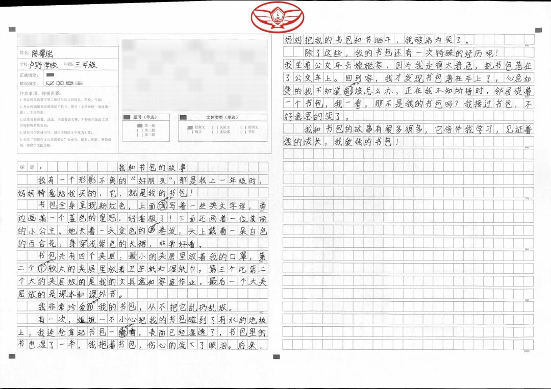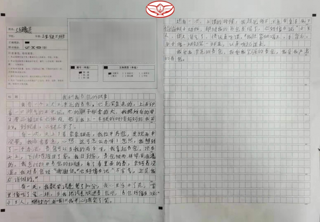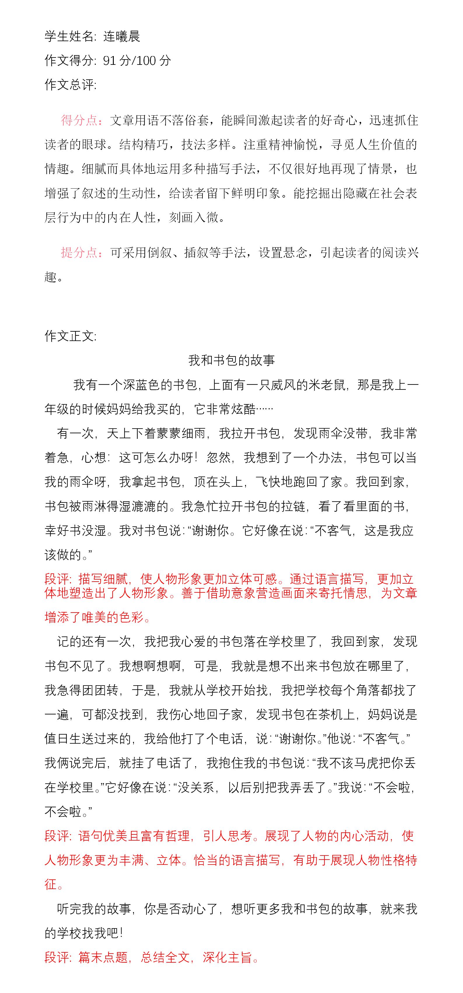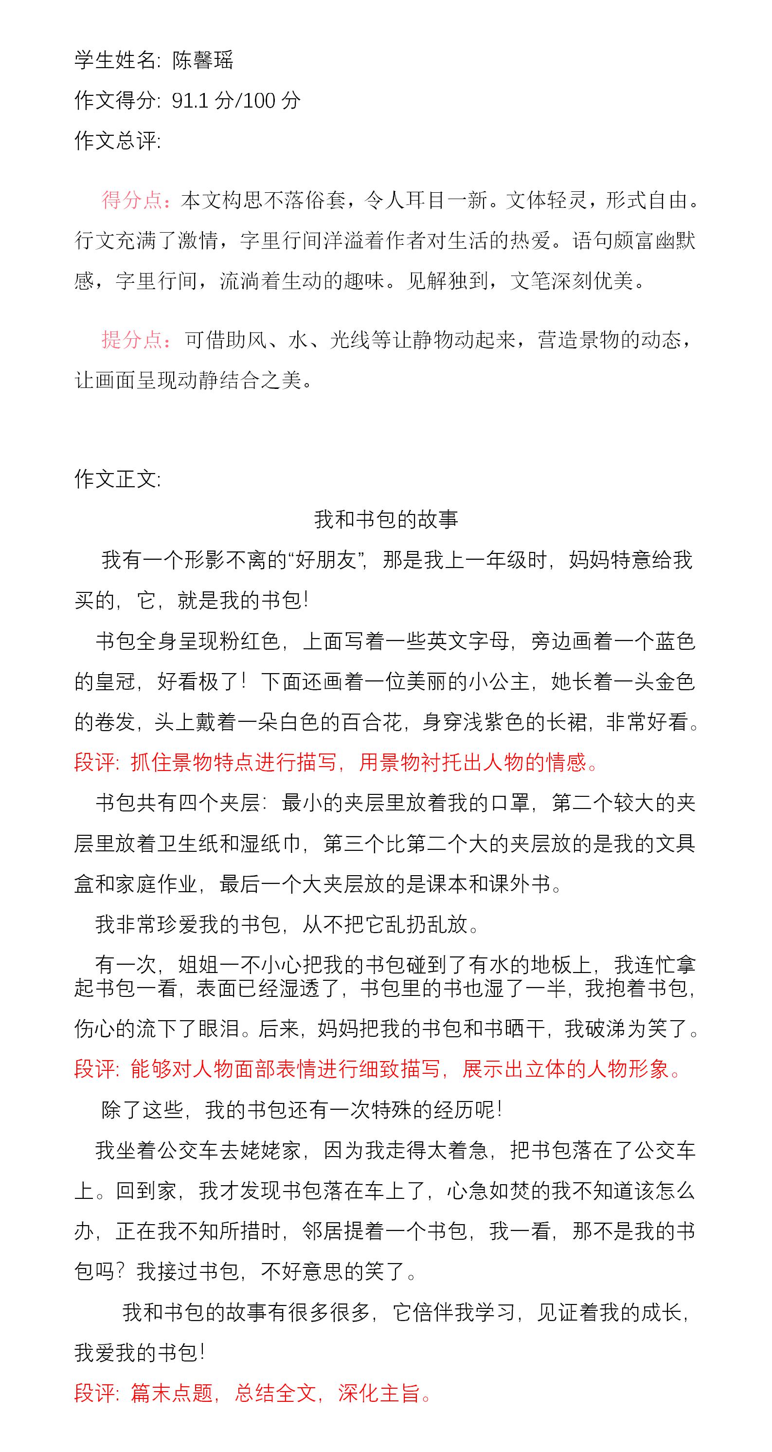 曦晨的文章构思巧妙,语言幽默生动。全文营造了一种幸福、温馨的氛围。把原本普通的小书包描写的绘声绘色,并将自己的喜怒哀乐融于文中,读来令人爱不释手。老师希望你做生活的有心人,用心发现生活中的美,写出更好的文章。