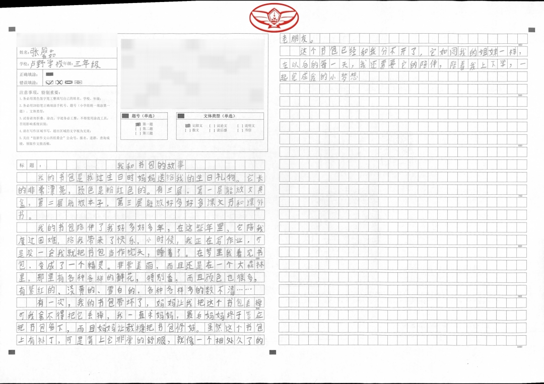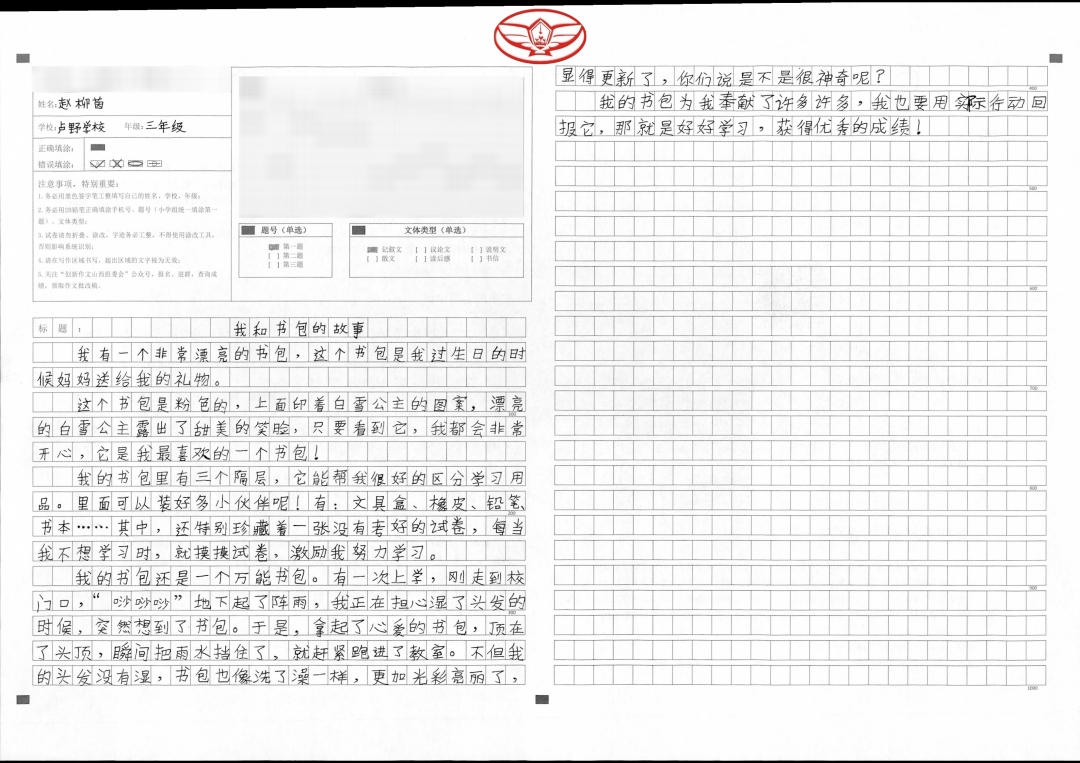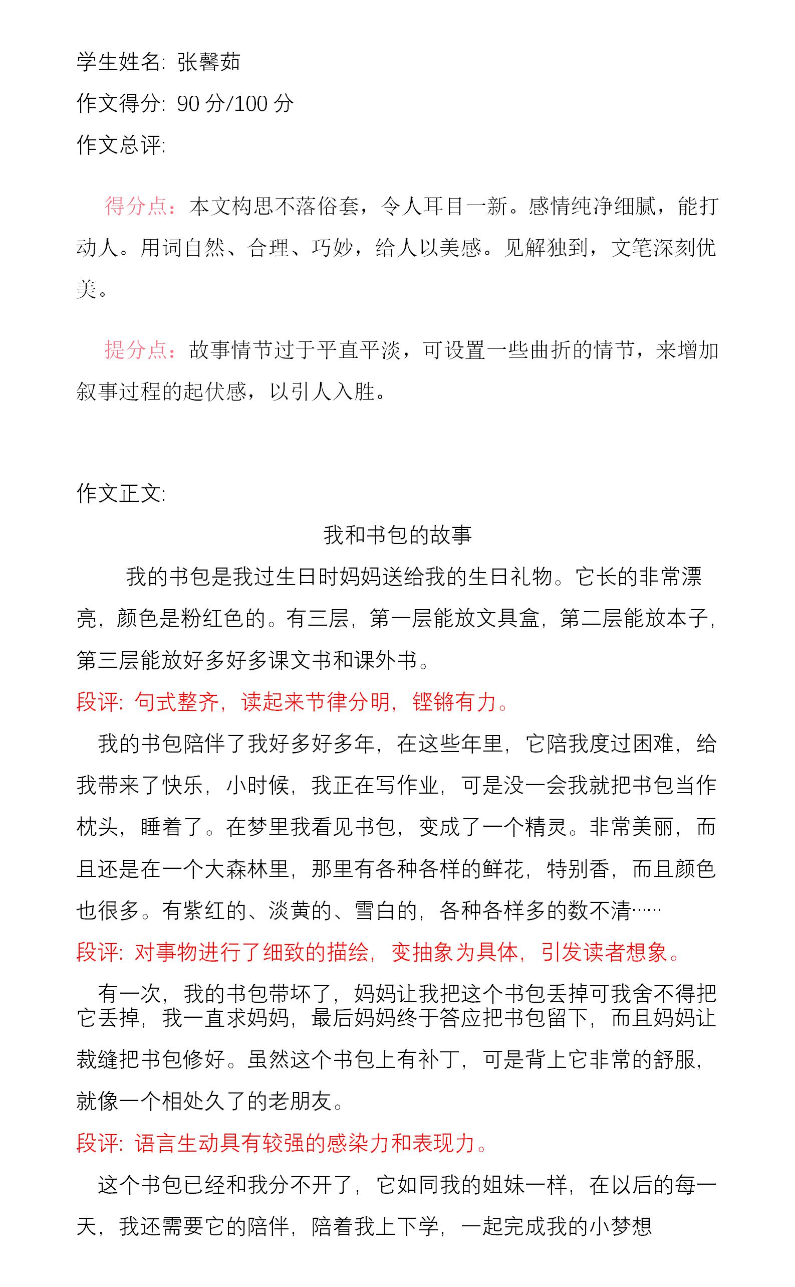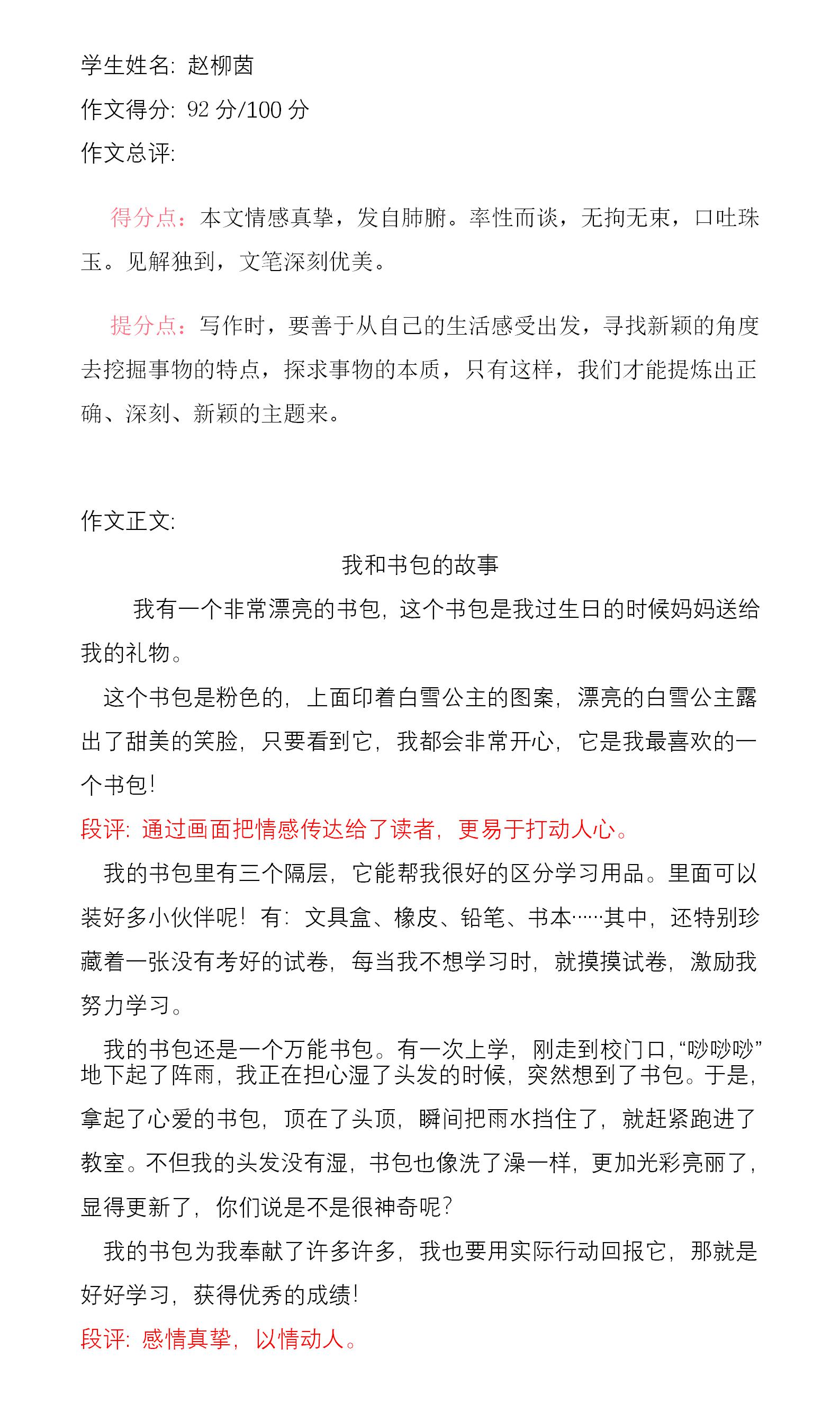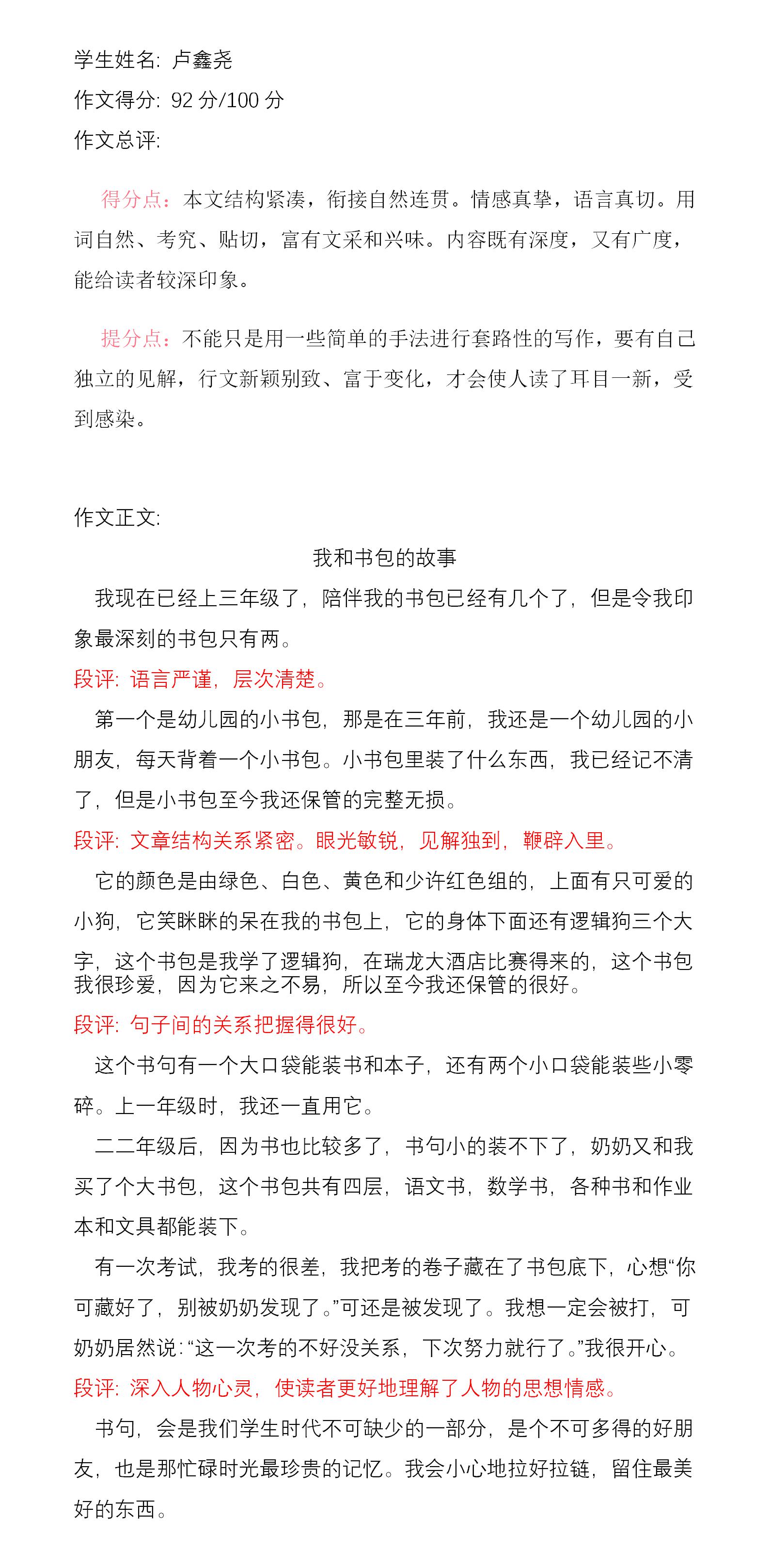 文章充满真情实感,记述了上学几年间印象深刻的两个书包,淡淡的讲述中渗透出了对书包深深的情感,也能看出你是一个很有心,而且重感情的好孩子。老师觉得你多读书,灵活地读,写文章更放得开些,灵活运用各种描写修辞等,会更能展示出你的内心情感。