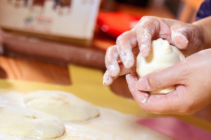 第三步,把面卷切成2-3个同等大小的面块,擀成圆形小饼