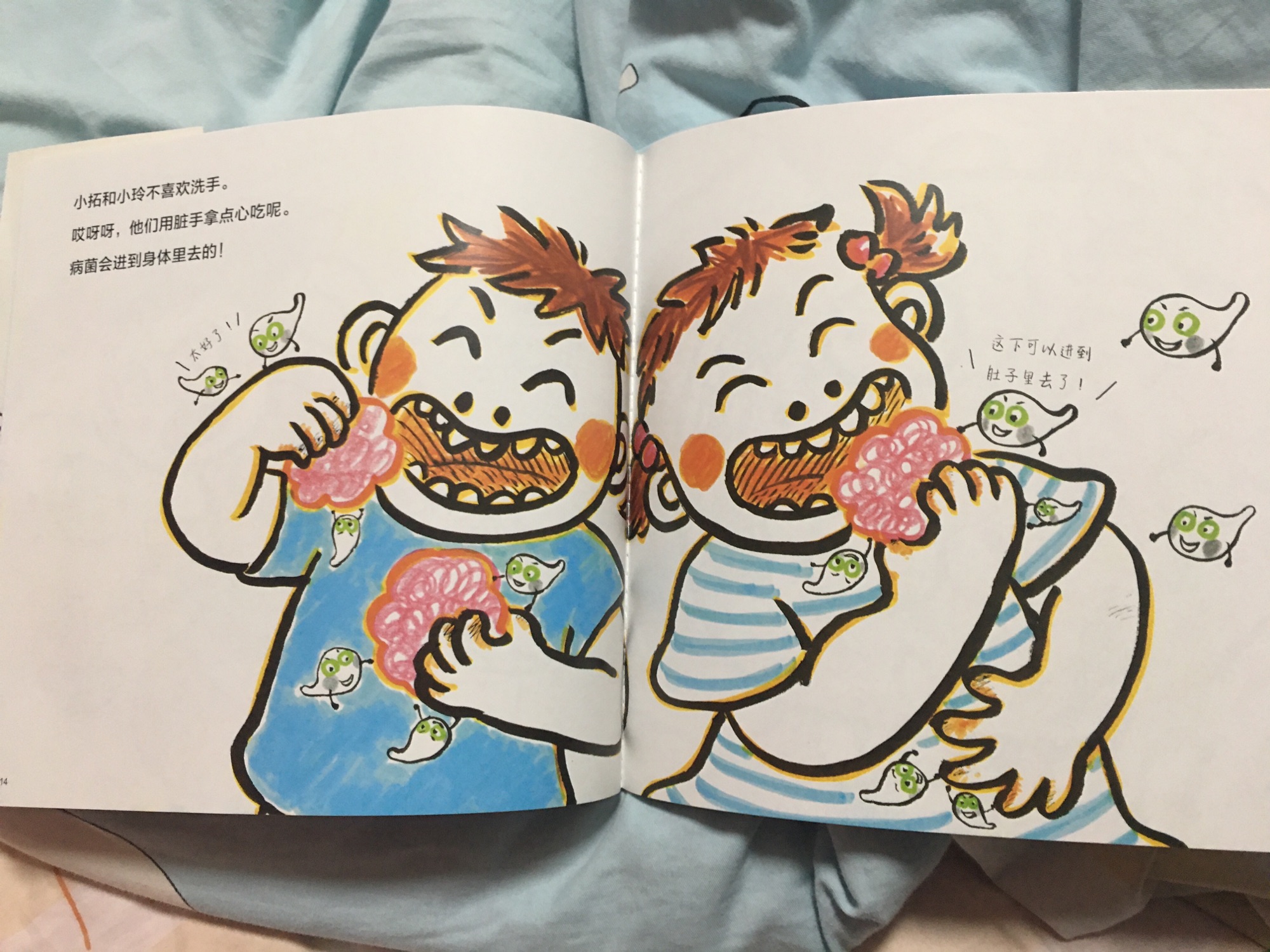一起又探讨了一会病菌。很喜欢一起探讨这种感觉。 绘本很棒,宝宝可以完全听文字看图片听懂里面的内容,还能联系到生活中。比我们自己和他讲更清晰明了。
