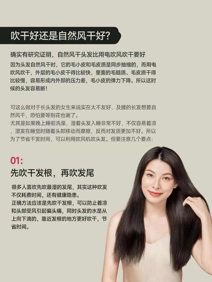 在吹干头发方面,虽然自然风干比使用电吹风更好,原因是因为自然风干时,头发的毛小皮和毛皮质会同步抽缩。但是对于【长发的女生】来说,等到头发完全自然风干可能需要很长时间!