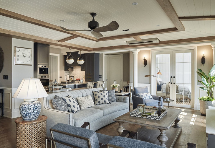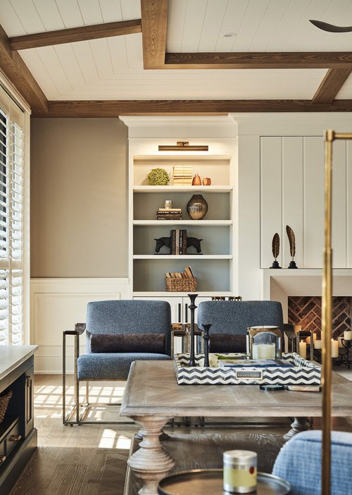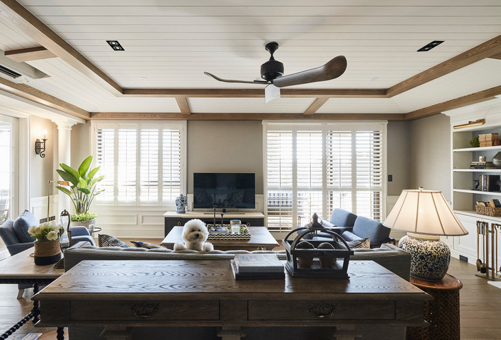 今天分享一组治愈温馨的美式休闲风格案例。设计师以干净自然的木质基底勾勒轮廓, 客厅运用木屋斜屋顶设计,搭配吊隐、壁挂空调形塑挑高视感,木百叶窗引入充沛采光,照射在深棕色地板上,布艺沙发与休闲椅朝窗面摆置,使室外明亮景致成为最佳视野。