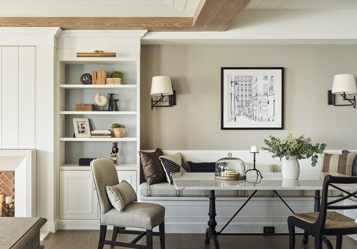 开放式布局家具跳脱以往一桌几椅配置概念,藤编深棕木餐椅、大理石餐桌堆叠质材层次,由低彩度选色串连一侧展示书架,围塑优雅午茶角落。厨房选用墨蓝色系,构建带着复古气息开放式实用的岛台及厨房。主卧添加屋主喜欢法式推拉门元素,配置有宽阔明朗的更衣室,清雅简约家具材质,在都市丛林中构筑一隅悠闲自在。