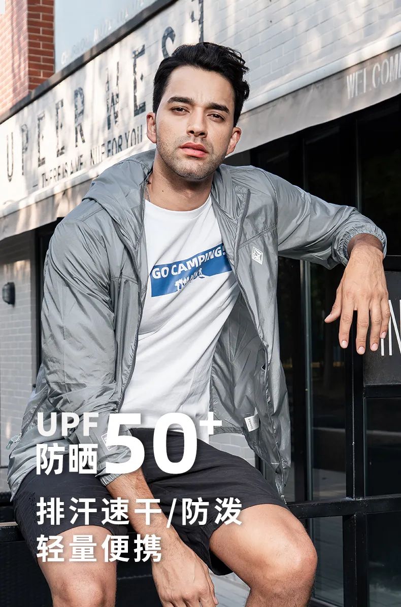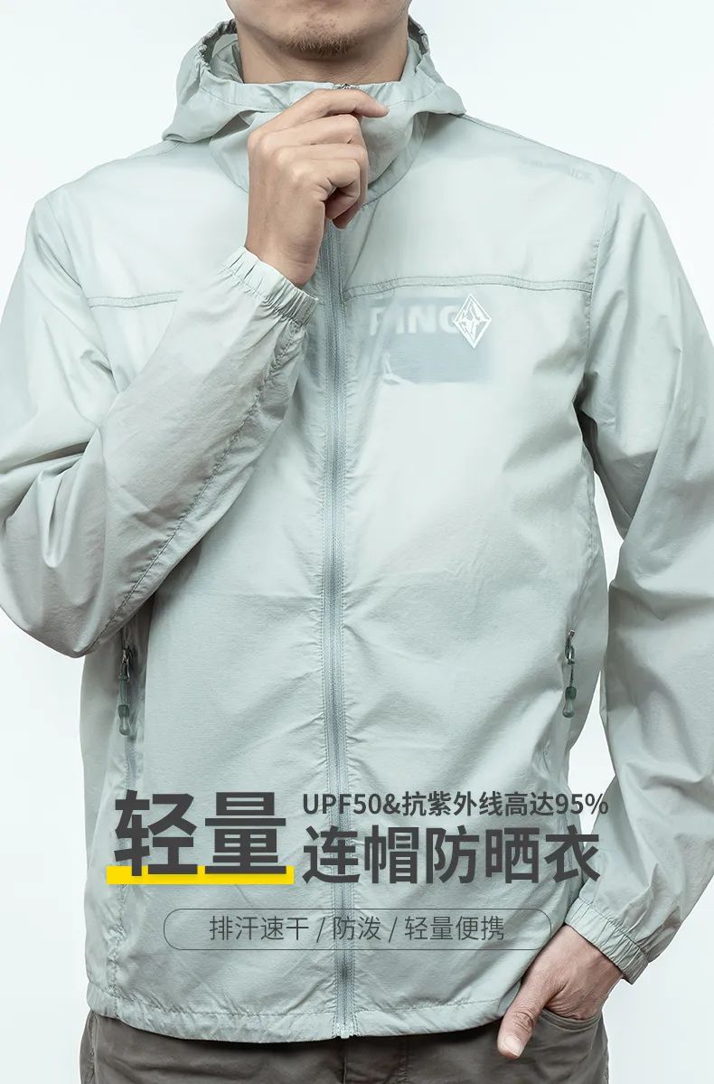 采用东丽克轻20D面料,轻盈柔软,不闷热!防晒指数高达UPF50+,有效抵御紫外线UVA,UVB,保护皮肤远离紫外线损伤!表面经DWR防泼水技术处理,水滴凝聚成珠,可从衣服上自行滚落。