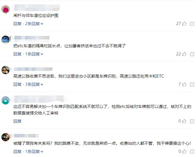 对于以上的处罚和措施,广大网友们都觉得无痛无痒,这样根本就是治标不治本。有一个比较靠谱的方法就是增加导流护栏的长度,把识别系统放在护栏尾部,这样就是别人插队进来,也识别不到后方车辆的ETC,也就不存在被蹭了。