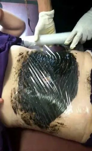 然后,敷上保鲜膜,带上自热能量腰带,让中药的药性更持久深入地发挥出来,同时促进身体的吸收,这个过程大概会进行两小时左右。
