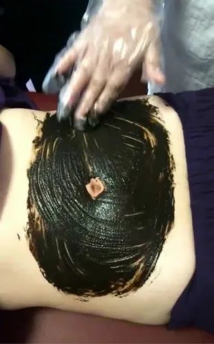 第三步,打开中药能量膜外敷包,把药膏均匀地敷在整个肚子上,深层去水湿、消脂肪、调脾胃。