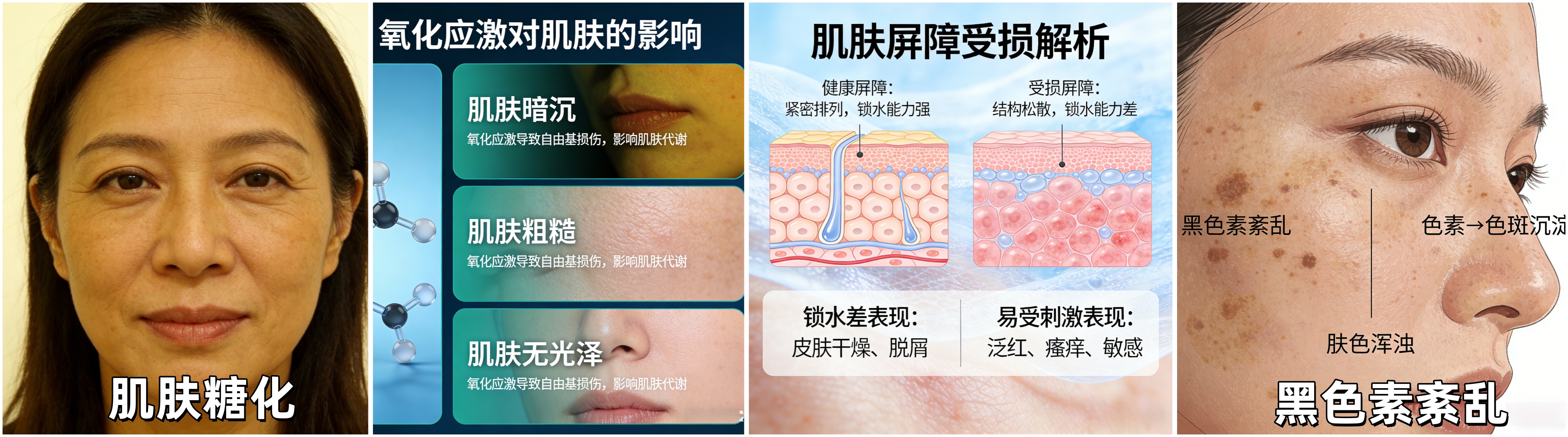 5️⃣ 色素紊乱:黑色素生成增加+细胞自噬能力下降,无法清理老化色素→色斑沉淀、肤色浑浊。
