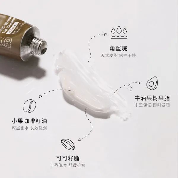 首先,作为一支涂上嘴的东西,它6不含,不含传统防腐剂(复合无防腐宣称),不含传统香精香料,不含酒精,不含风险成分,不含孕妇慎用成分,不含争议成分。其次,我们在看看它含什么,居然可以标榜自己淡纹?!10种丰富的保湿剂(其中包含水相保湿剂,也包含油相保湿剂),6种抗氧化剂,4种抗击唇部肌肤微炎症的成分,2种美白成分,2种舒缓抗敏成分。下一步,我们具体问题具体分析,这是一支唇霜,其最重要的功能就是唇部保湿。甘油等多元醇保湿成分;