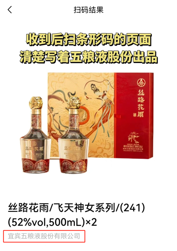 同时,酒瓶和酒盒上都一致标有五粮液正宗出品的W标。