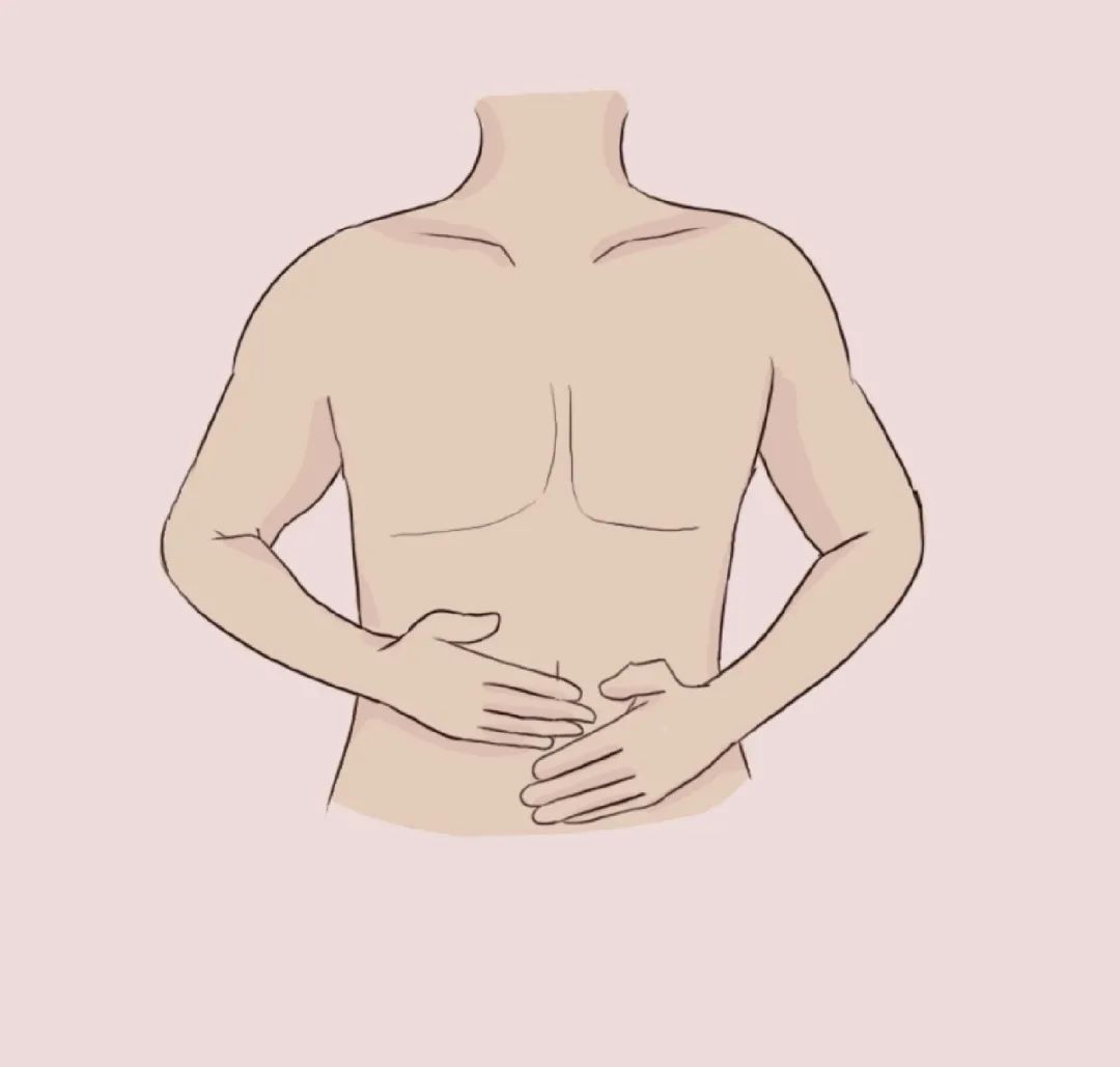 双手叠放,掌心对着肚脐,向下向外,螺旋状扩大按揉范围